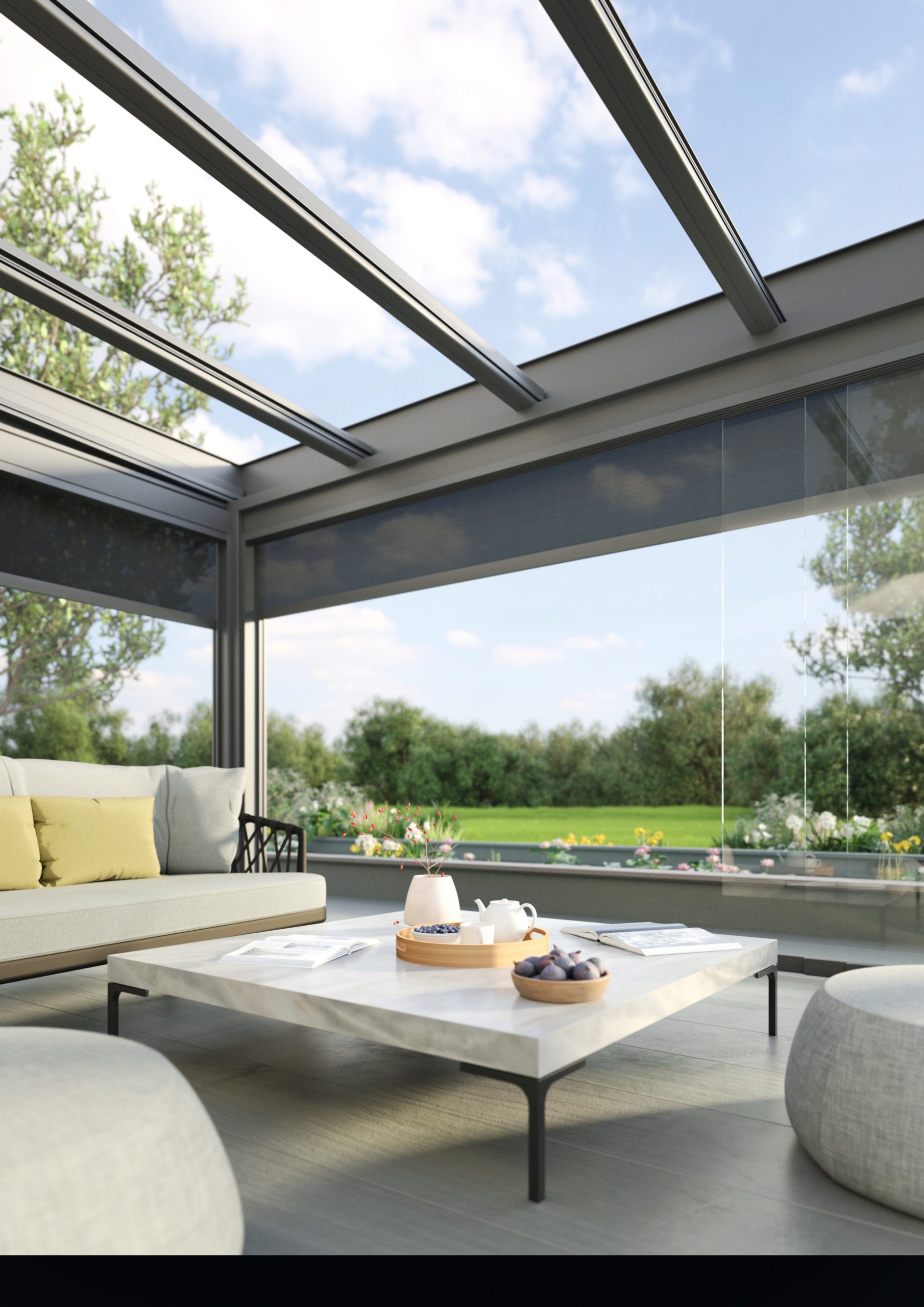 Die gerahmte Schiebetür der Serie 35 eignet sich für Terrassenüberdachungen und Kaltwintergärten. Mit einer maximalen Flügelgröße von 2,5 x 2,5 Metern lässt sie sich als Windschutz und als Raumteiler einsetzen. Bei einer sehr geringen Flügel-Bautiefe von nur 35 Millimeter sind besonders kompakte Konstruktionen möglich.