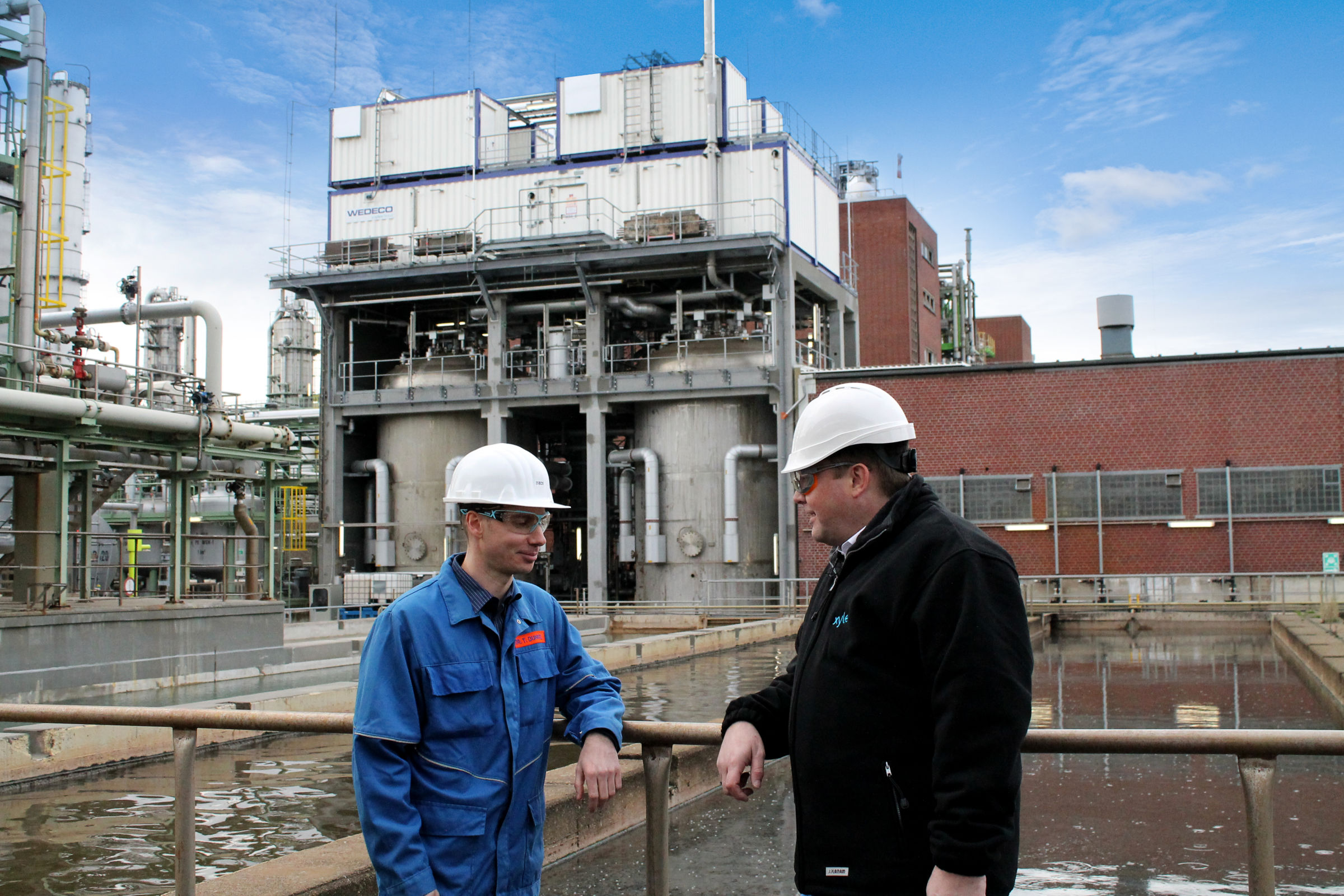 In enger Zusammenarbeit entwickelte Xylem eine maßgeschneiderte Pumplösung. Dr.-Ing. Thiemo Dunkel, Betriebsleiter Energiebetriebe Wasser, INEOS (links), und Dr. Tim Pühmeier, Global Product Manager Wedeco Ozone Systems, begutachten das Ergebnis.