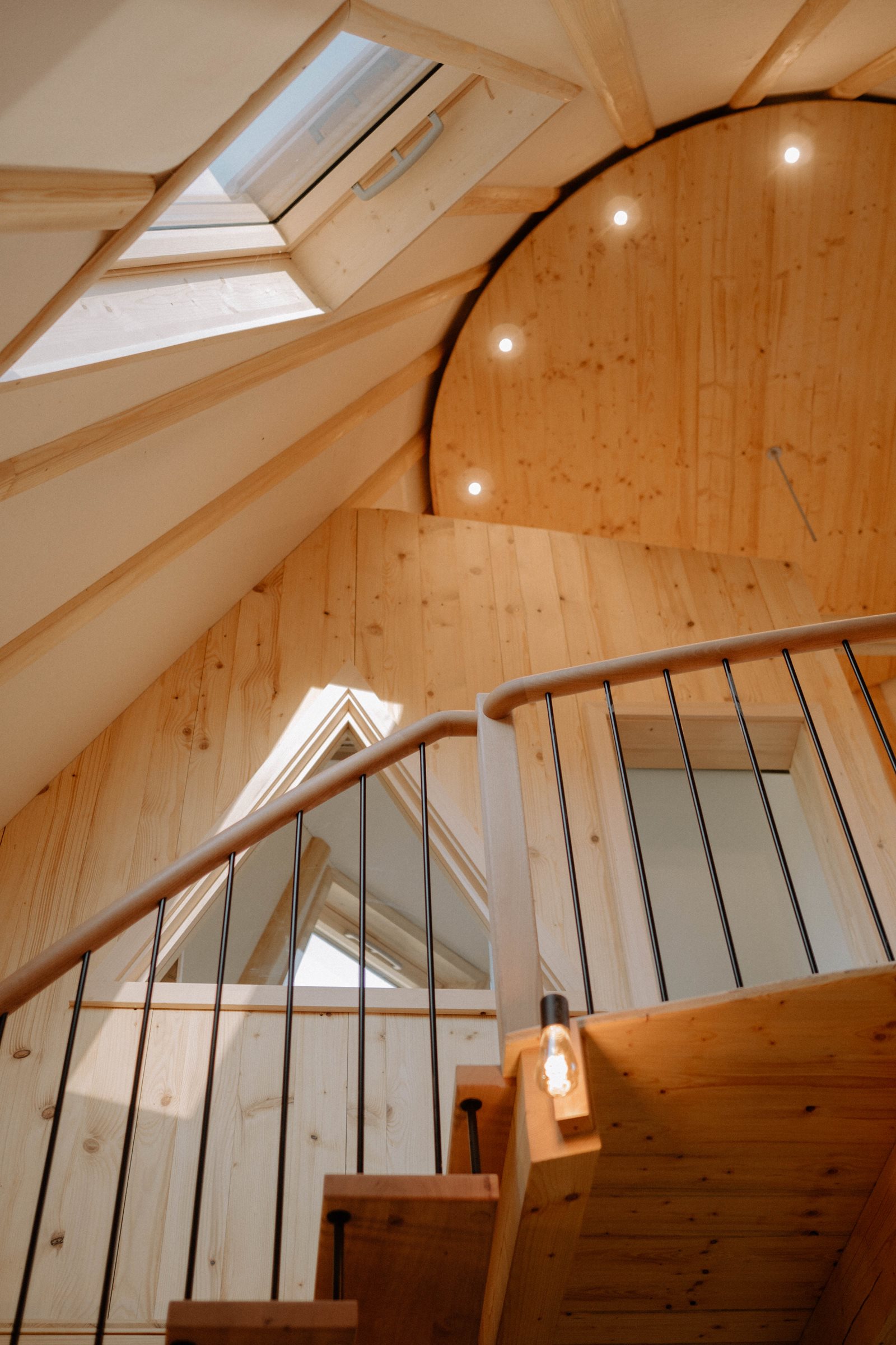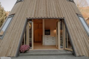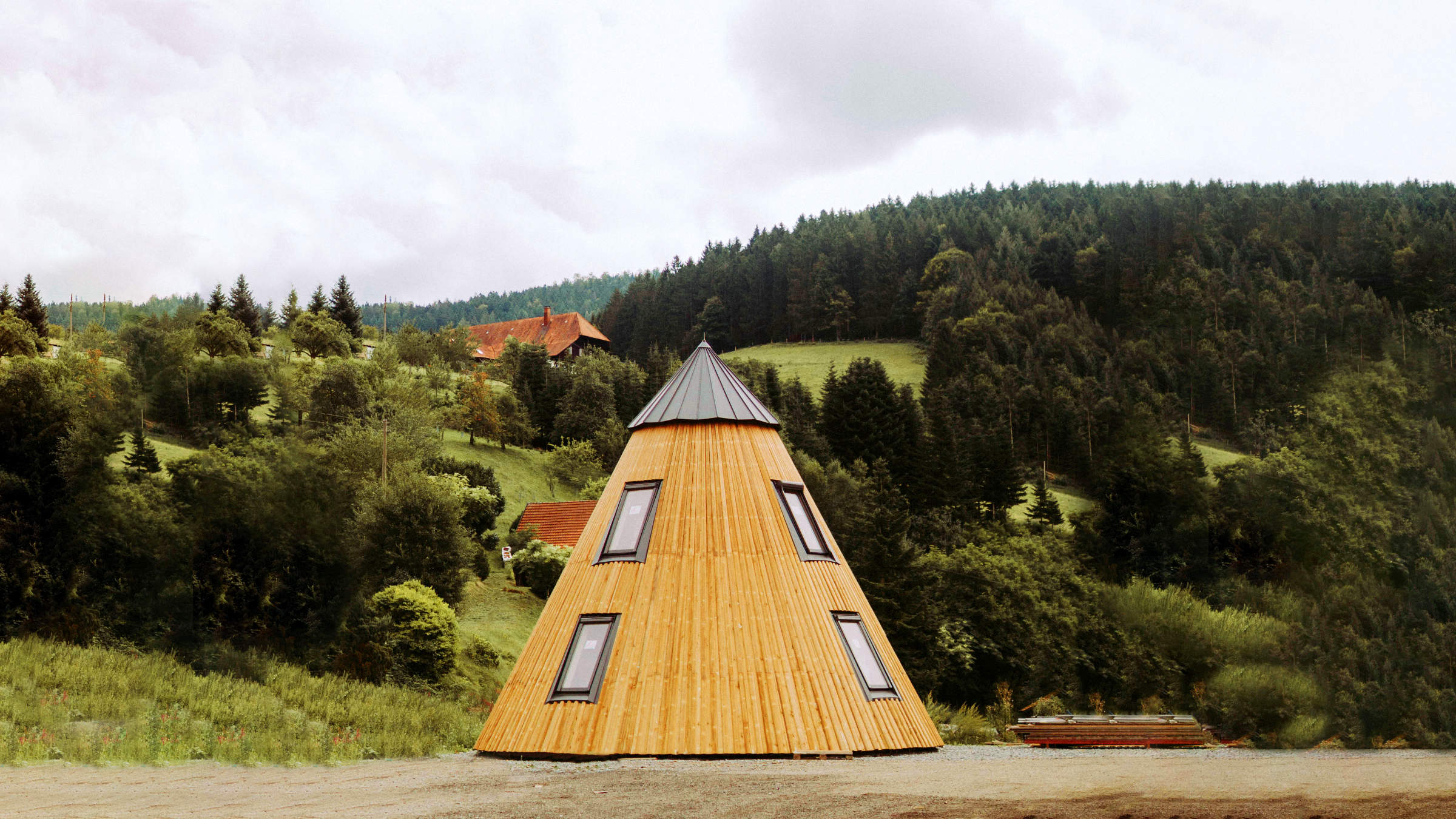 Funktionale Aspekte wie Langlebigkeit und Energieeffizienz stehen bei „SpiritHome“ im Fokus: Mit einer Fassade aus Holz fügt sich das Tipi als Niedrig-Energie-Haus harmonisch in seine idyllische Umgebung ein. Holz als Werksstoff ist ökologisch und sorgt für Behaglichkeit. „Das ist uns besonders wichtig. Um ein gutes Wohnklima zu schaffen, verwenden wir beim Bau des Tipis ausschließlich natürliche Baustoffe“, unterstreicht Olivia Junker.