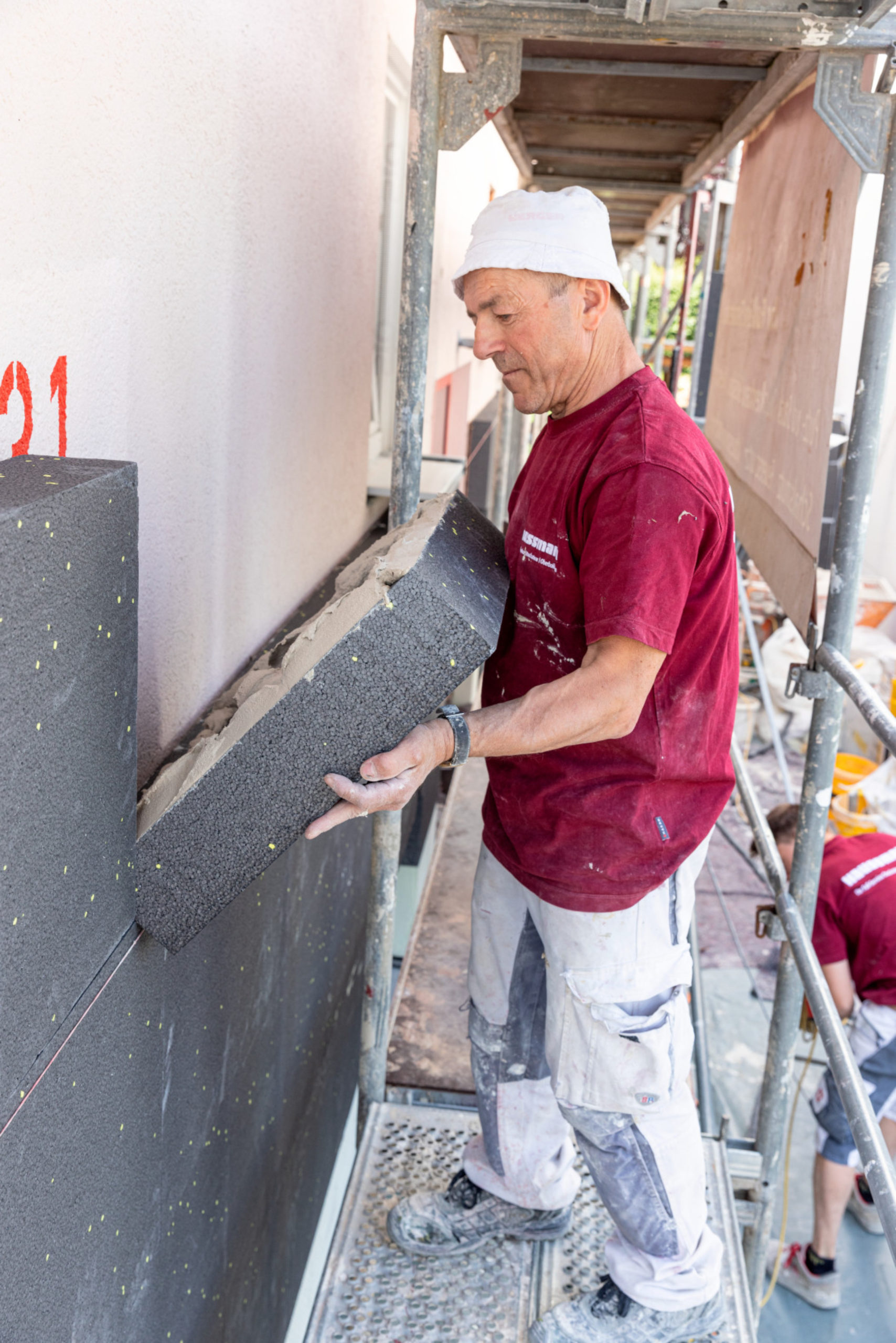 Bei der Wahl des Dämmstoffes ging Fassadenprofi Hans Haussmann auf die Vorstellungen des Bauherrn ein: „Er hat sich eine wirtschaftliche und effiziente Fassade gewünscht. Bei Mehrfamilienhäusern empfehlen wir aufgrund des guten Preis-Leistungs-Verhältnisses meist eine Dämmung aus Polystyrol“, erläutert Haussmann. „Die großen Wandflächen wurden mit dem System StoTherm Vario gedämmt. Es besteht aus einer mineralischen Klebe- und Armierungsmasse, einer Dämmplatte, einem organisch gebundenen Oberputz und einer Fassadenfarbe. Sie schützt den kompletten Wandaufbau langfristig vor der Witterung. Um bei der Dämmung der innenliegenden Balkone wenig Fläche zu verlieren, haben wir die Nischen mit einem Hochleistungsdämmsystem (StoTherm PIR) mit besonders schlanken Dämmplatten ausgeführt.“