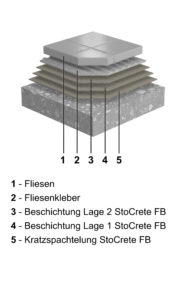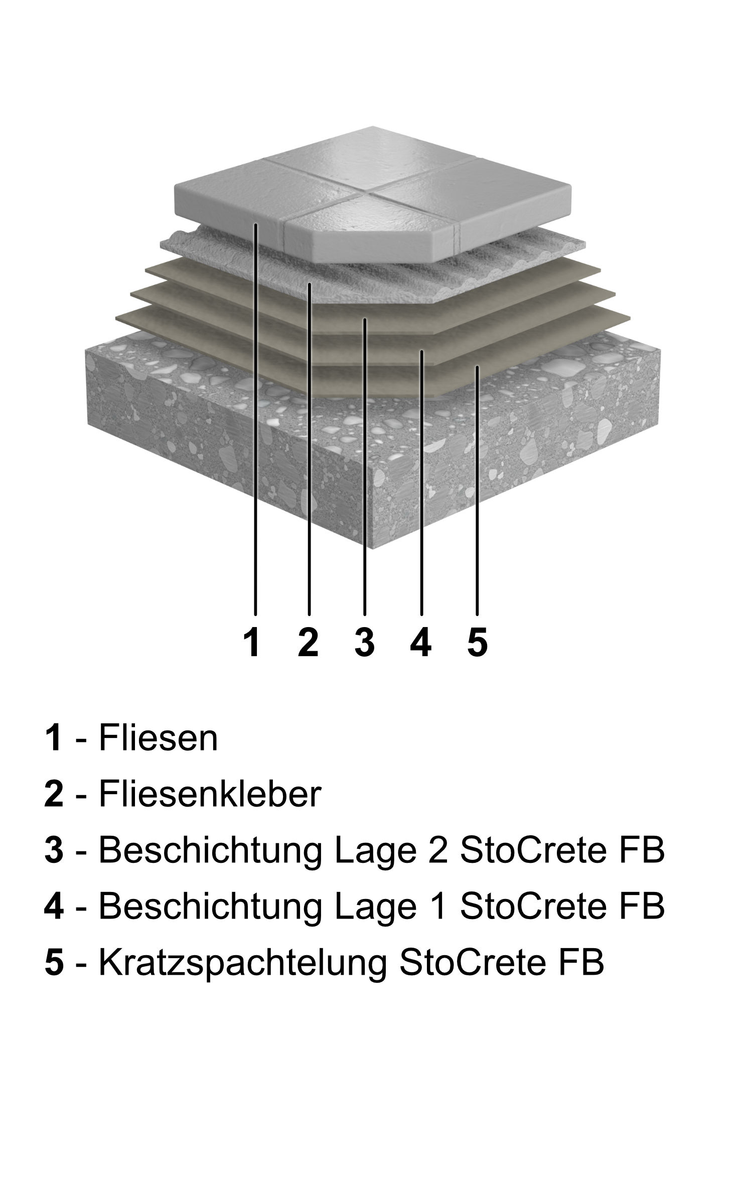 Die Systembeschichtung StoCrete FB ist statisch und dynamisch rissüberbrückend sowie beständig gegen thermische Spannungen, die durch den Wechsel von direkter Sonneneinstrahlung im Hochsommer und kaltem Wasser bei Gewitterregen verursacht werden. Damit verhindert die Abdichtung das Eindringen von Wasser und in Wasser gelösten Schadstoffen in den Betonuntergrund und schützt die Bausubstanz dauerhaft. Jetzt liegt für den Boden-Allrounder auch das allgemeine bauaufsichtliche Prüfzeugnis als Abdichtung im Verbund mit Fliesen- und Plattenbelägen vor. StoCrete FB kann außen und im Innenbereich außerhalb von Aufenthaltsräumen eingesetzt werden.