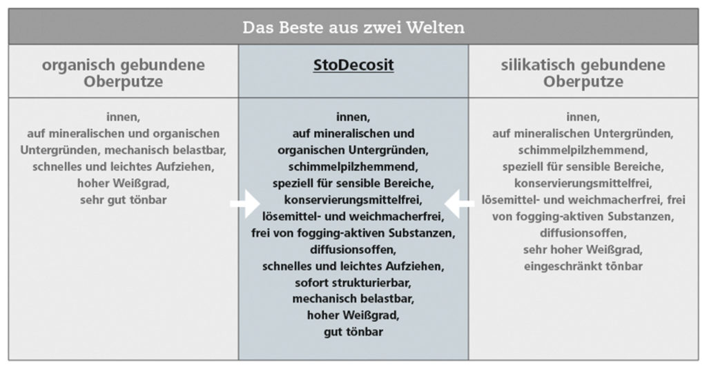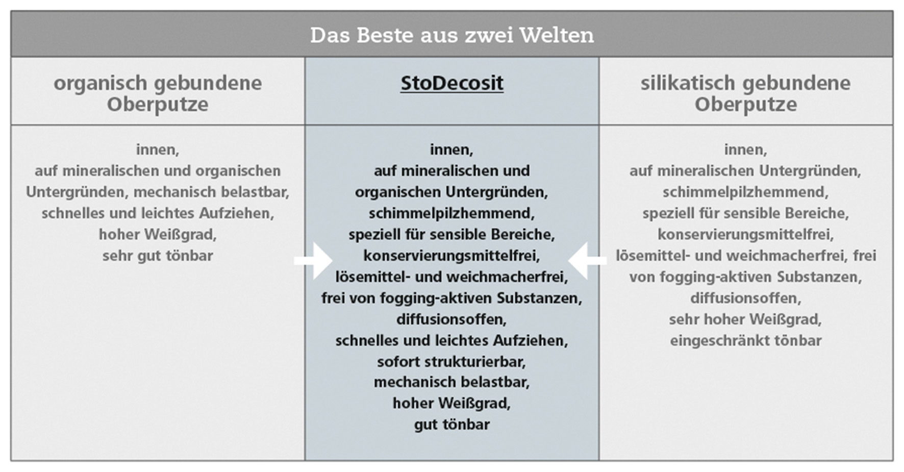 Alles wird immer komplizierter? Das stimmt nicht ganz; zumindest bei den Innenputzen wird jetzt vieles einfacher. Denn der neuartige Innenputz StoDecosit vereint künftig die Eigenschaften verschiedener Putze in einem Produkt. Er ist strapazierfähig wie ein organischer und schimmelhemmend wie ein silikatischer Putz. Er ist konservierungsmittelfrei sowie umwelt- und ressourcenschonend. Er besitzt eine matte mineralische Oberfläche bei optimalem Aufziehverhalten und kann exakt strukturiert werden.