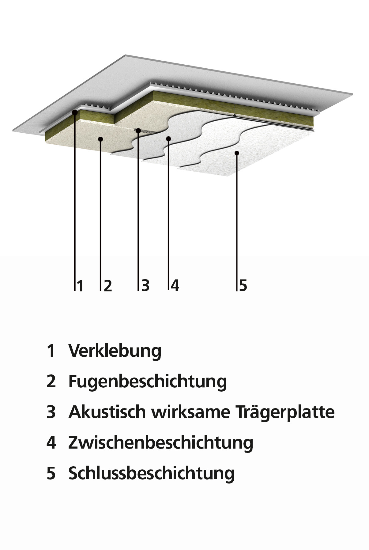 Das einfach und schnell zu montierende Direktsystem eignet sich besonders für große Flächen. Es kommt ohne aufwendige Unterkonstruktion aus und kann wegen seiner minimalen Aufbauhöhe auch problemlos in niedrigeren Räumen eingesetzt werden. Die Platten aus beschichteter Mineralwolle zeichnen sich durch eine hohe Schallabsorption aus. Je nach gewählter Beschichtung und Schichtdicke reichen die Schallabsorptionswerte nach EN 11654 von αw 0,60 bis 1,00. Die Akustikplatten werden direkt auf Decken oder Wänden verklebt. Da hierfür fast jeder Untergrund geeignet ist, überzeugt das System auch bei Sanierungsaufgaben.