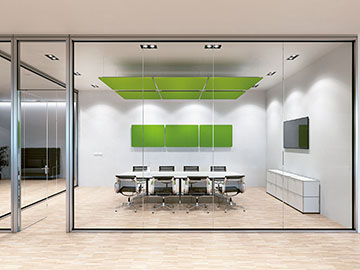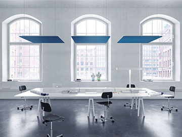 Das variable Deckensegelprogramm StoSilent Modular verbessert die Akustik und ist ideal für die nachträgliche Montage in bereits genutzten Räumen. Auch für Gebäude mit Betonkern-Aktivierung eignen sich die vielfältigen Systemvarianten, deren Schallabsorption je nach Oberfläche, Abhänghöhe und Format variiert. Dank der flexiblen Abhängung und der Variationsmöglichkeiten in Form und Farbe wirken die Segel zusätzlich als Gestaltungselement. Vor allem die Variante StoSilent Modular 300 wird besonderen gestalterischen Ansprüchen gerecht. Die gerade mal acht Millimeter schlanke Absorberplatte aus Polyesterfasern ist mit einer drei Millimeter dünnen, sichtbaren Aluminium-Profilkante eingefasst und wurde mit dem German Design Award 2017 ausgezeichnet. Die gemeinsam mit dem Designstudio ID AID, Stuttgart, entwickelte edle Optik überzeugte die Juroren, da sich „das Paneelsystem mit vergleichsweise dünner Polyester-Faserplatte und hochwertigen haptischen Oberflächen (…) sowohl in freien Formen und Gruppen wie auch in Rastern oder komplexeren freien Rasterfeldern anordnen“ lässt.