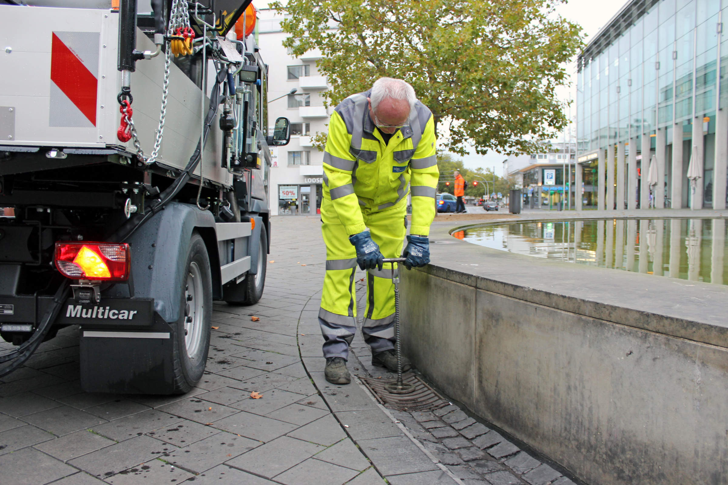„Gully-Pflege“: Mit einem speziellen Hebegerät wird das Gitter über dem Sinkkasten abgehoben.