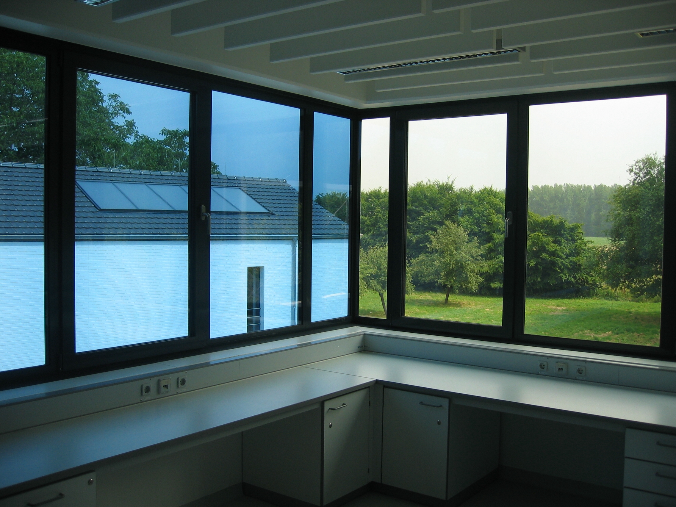 Das schaltbare Sonnenschutzglas besteht aus einer elektrochromen Verbundglasscheibe mit einer dazwischenliegenden nanostrukturierten Beschichtung. Ein geringer elektrischer Impuls sorgt dafür, dass sich das Glas verfärbt – der sogenannte „elektrochrome Effekt“. Strom fließt also nur, um den Zustand zu ändern. Um flexibel auch den Einfluss der Sonneneinstrahlung regulieren zu können, stehen bei manueller Schaltung fünf Verdunklungsstufen zur Wahl. Entwicklungsarbeiten zum schaltbaren Sonnschutzglas wurden vom BMWi (FKZ: 0327233J) gefördert.