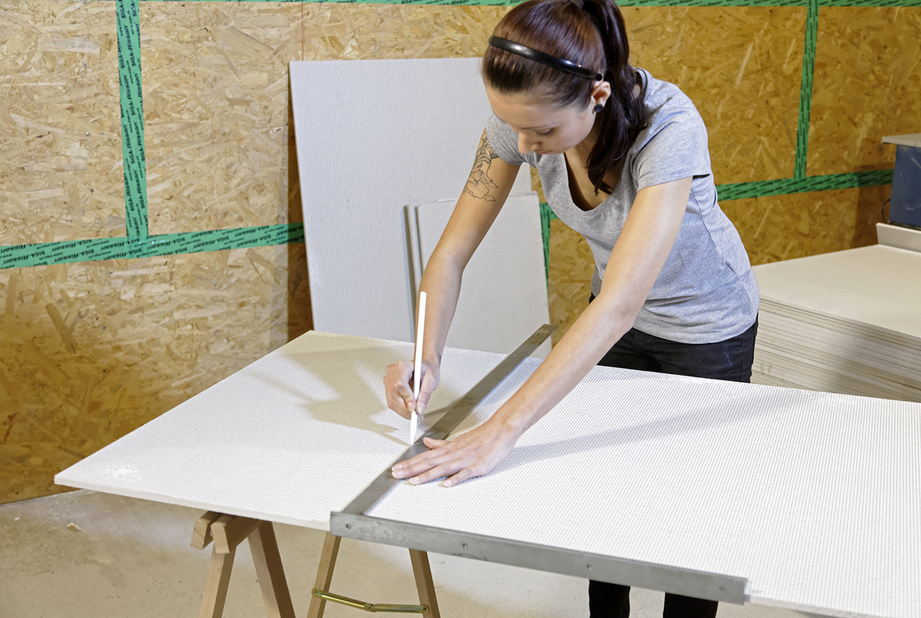 Da die Platten stumpf gestoßen werden (sie sich also an den Kanten berühren), muss besonders die erste Platte exakt lotrecht montiert sein – denn an ihr richten sich die weiteren aus. Um die Platten sicher zu verschrauben, übertragen Sie mit Wasserwaage und Bleistift den Verlauf des Ständerwerks auf die Platte. Die Schrauben sollten dann in einem Abstand von 20 bis 25 Zentimetern gesetzt werden und bündig mit der Plattenfläche abschließen. Kreuzfugen sind zu vermeiden – daher kommt für die zweite Reihe zunächst ein Zuschnitt an die Wand. Dafür einfach die Länge abmessen, die Platte mit dem Cutter anreißen, knicken und brechen, dann das rückseitige Gewebe durchtrennen. Die Schnittkante sollte nur leicht geschliffen werden.