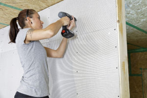 Voraussetzung: Ein Holzständerwerk im 40-Zentimeter-Raster, idealerweise sind die Gefache mit Dämmstoff gefüllt. So lassen sich die Standard-Platten bequem im Ganzen (Maß: 120 x 80 cm) direkt auf das Holz schrauben. Die Beplankung beginnt am Boden. Dafür ist zunächst die Höhe für die erste Platte abzumessen – mit circa 5 Millimeter „Luft“ für eventuelle Bauwerksbewegungen. Die Markierung kommt also etwa bei 80,5 cm Höhe an die Latte. Dieses Maß wird dann mit einer großen Wasserwaage auf alle Latten übertragen.