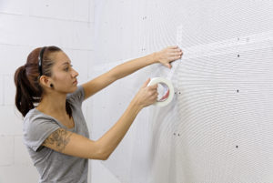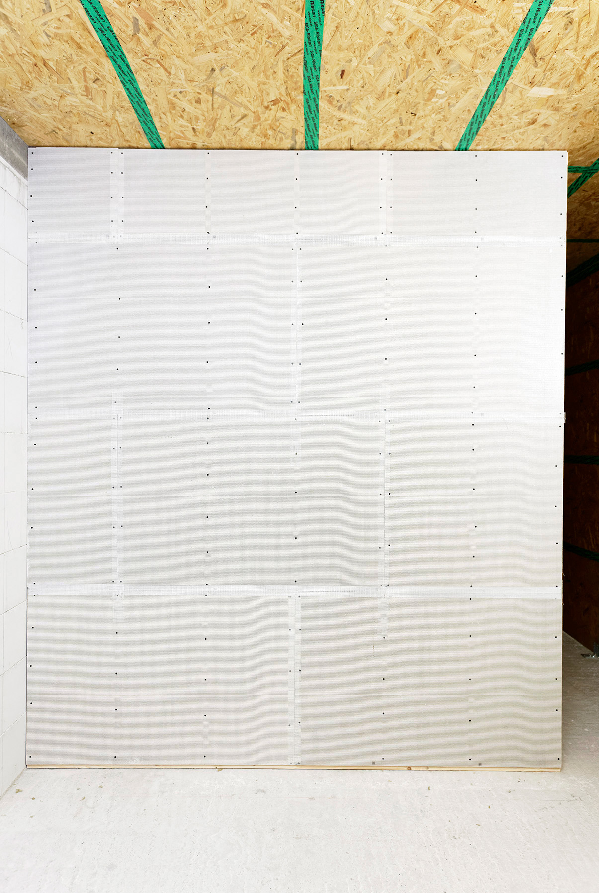 Die fertige Wand wird dann mit einem Handbesen staubfrei gemacht. Anschließend werden die Fugen mit dem selbstklebenden Gewebeband kaschiert. Aufgrund der hohen Stabilität der Platte genügt bereits eine einlagige Beplankung. Auch die im herkömmlichen Trockenbau üblichen Arbeitsschritte Spachteln – Schleifen – Grundieren sind bei anschließender Putz- oder Fliesenbeschichtung* bei VeroBoards nicht erforderlich – es geht gleich mit der Schlussbeschichtung weiter.
