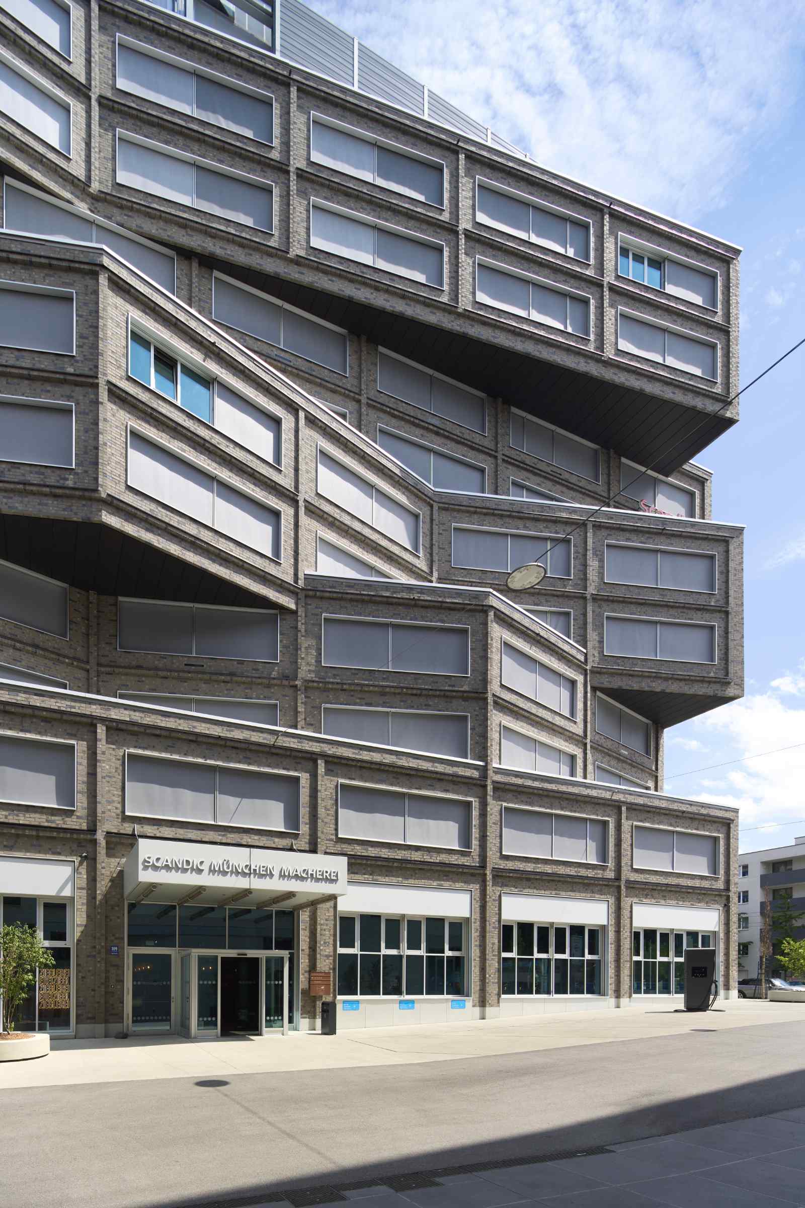 Die versetzt-verschobenen Etagen des Scandic Hotels – Teil des neuen Quartiers „Macherei“ in München – schaffen ungewöhnliche Sichtachsen. Zugleich entstehen Dachterrassen, die wie private Rückzugsorte wirken.