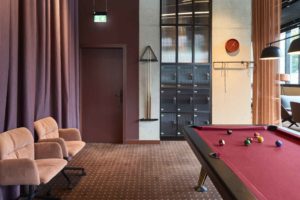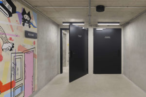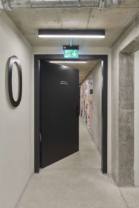 Im Scandic Hotel kommen viele Türen in den jeweiligen Spezifikationen von Teckentrup (Verl). Der Hersteller bietet ein umfangreiches Stahltüren-Programm, aus dem sich für die unterschiedlichen Anforderungen maßgeschneiderte Lösungen wählen lassen – auch in Sonderformaten und mit der Anbindung an die Gebäudeleittechnik. Als Basismodell dient die „Teckentrup 62“ mit planem Türblatt. Türen und Zargen sind im selben Farbton gehalten: In den meisten Fällen ein mattes Schwarz, wenn die Innenarchitektur einen anderen Farbton vorsieht, auch in einem dunklen Rotbraun.