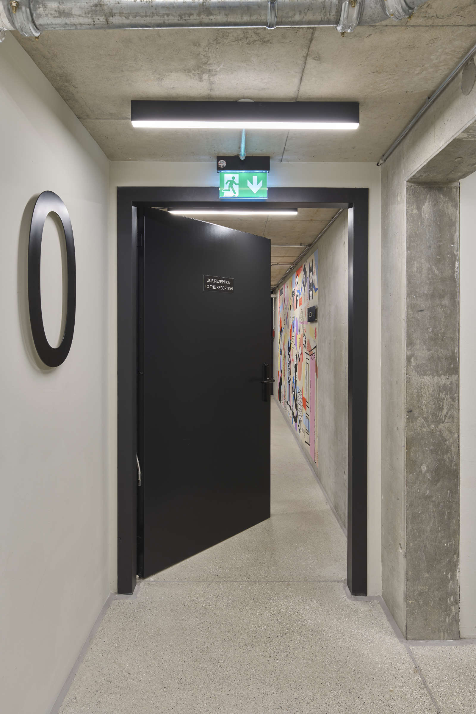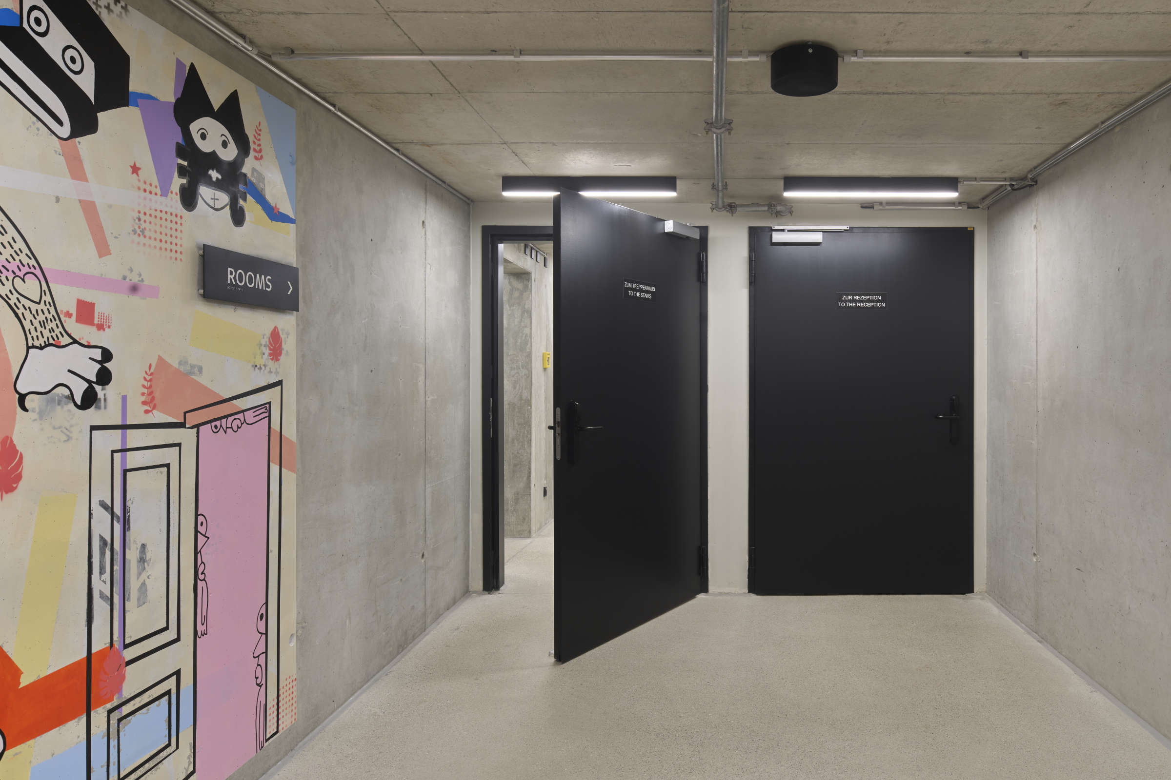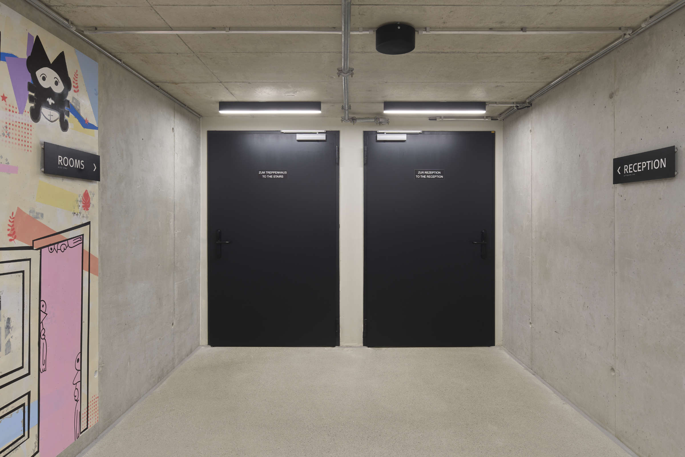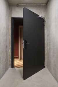 Eleganz auf jeder Ebene: Die Türen zum Hotel (links zum Treppenhaus, rechts zur Rezeption) erfüllen nicht nur die Brandschutzanforderungen, sondern überzeugen auch gestalterisch im matten Schwarz für Türblatt und Zarge.