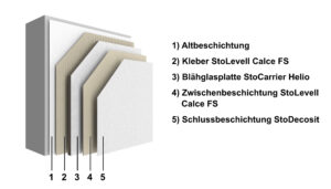 Um das Sorptionsverhalten (Fähigkeit zur Aufnahme von Wasserdampf) zu steigern, wird der Funktionsspachtel StoLevell Calce zusätzlich als Unterputz eingesetzt. Auf die Spachtelung kann StoCalce FS auch als Filzputz aufgetragen oder ein Silikatputz wie StoDecosit MP (konservierungsmittelfrei) appliziert werden – mit breiten Gestaltungsmöglichkeiten. Als Schlussanstrich eignen sich konservierungsmittelfreie Dispersionssilikatfarben wie StoColor Sil In oder StoColor Sil Comfort.