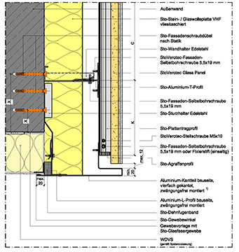 Kern der Bekleidung bei den meisten StoVentec-Systemen ist eine Putzträgerplatte aus Blähglasgranulat, die beidseitig mit hochzugfestem Glasfasergewebe ausgestattet ist. Dieser Verbund erzeugt eine statische Lastabtragungscharakteristik, die mit der von Stahlbeton vergleichbar ist. Dennoch ist das Eigengewicht der zwölf Millimeter dünnen Platte mit 6 kg/m2 sehr gering. Die Bekleidung erfolgt werkseitig mit Glasplatten oder Photovoltaik-Paneelen oder auf der Baustelle mit Putz, Natursteinfliesen, Klinker, Keramik, Glas oder Glasmosaik. Fällt die Entscheidung für eine verputzte Oberfläche, lassen sich vielfältige Strukturen und Farbtöne umsetzen, wobei keine Begrenzung des Hellbezugswertes zu beachten ist, also auch sehr dunkle Farbtöne in Frage kommen. Die Kombination mit massiven plastischen Fassadenelementen gehört ebenfalls zum Standardrepertoire.