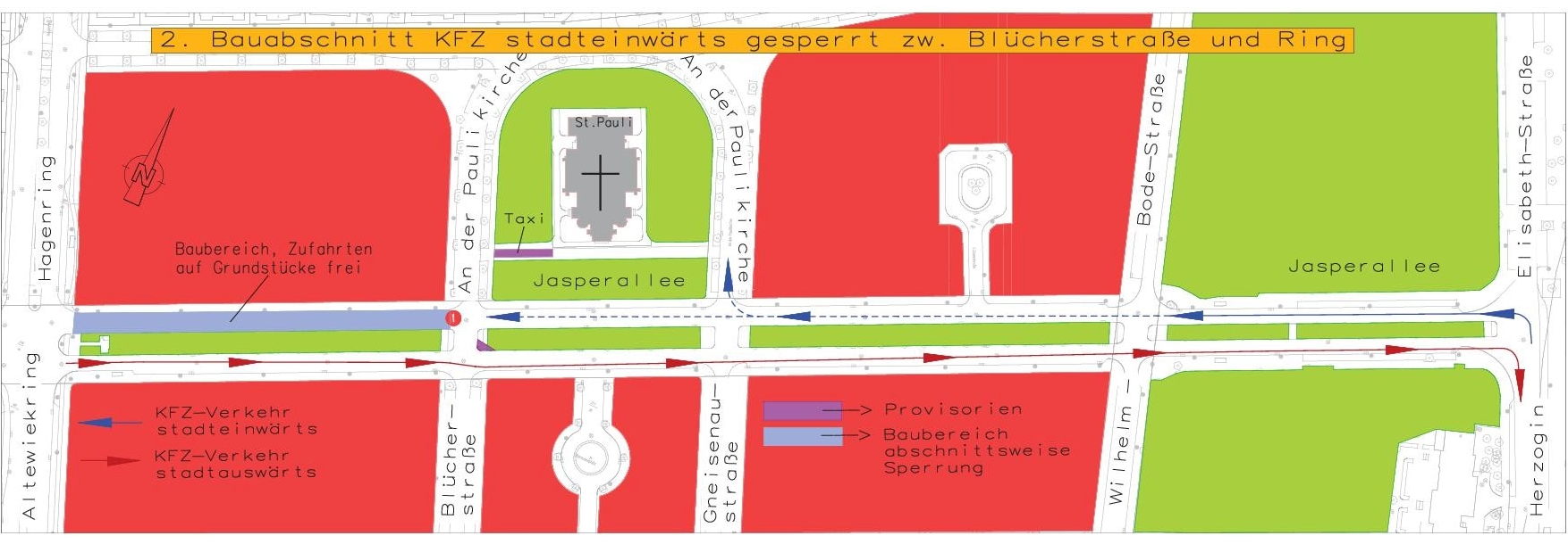 Durch Ersatzparkplätze vor der St.-Pauli-Kirche sowie am Stadtpark wird der notwendige baustellenbedingte Wegfall von Parkplätzen teilweise ausgeglichen. Radfahrer und Fußgänger werden gesichert an der Baustelle vorbeigeführt. Die anliegenden Grundstücke bleiben erreichbar.