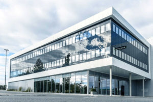 Elegant: Die schwarze sedak-gsp-Glasfassade eines Büro- und Werksgebäudes.
