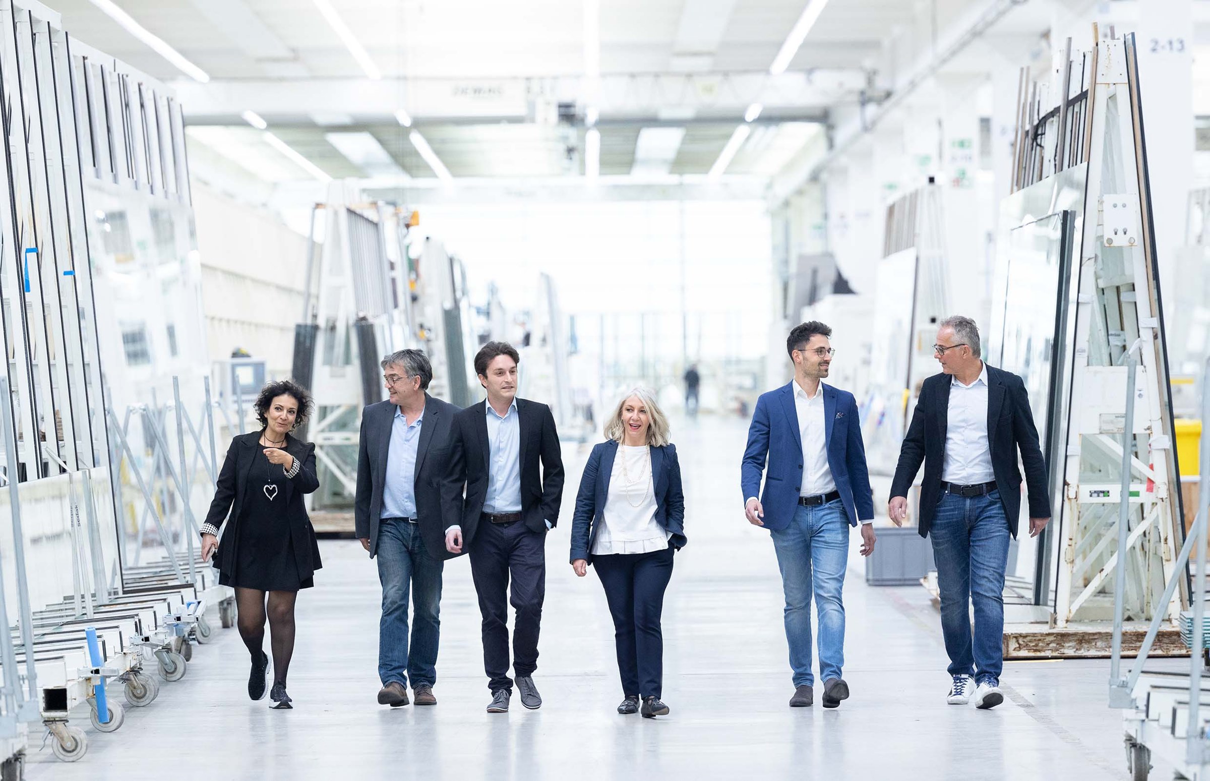 Kompetenz-Team für flaches und gebogenes Glas (v.l.n.r.): Maic Pannwitz (Vice president sedak, inc.), Beatriz Fernandez, Gery Chinzi, Guillaume Chinzi, Gaia Sperotto, Kevin Berni (Vertriebsleiter) und Ralf Scheurer.