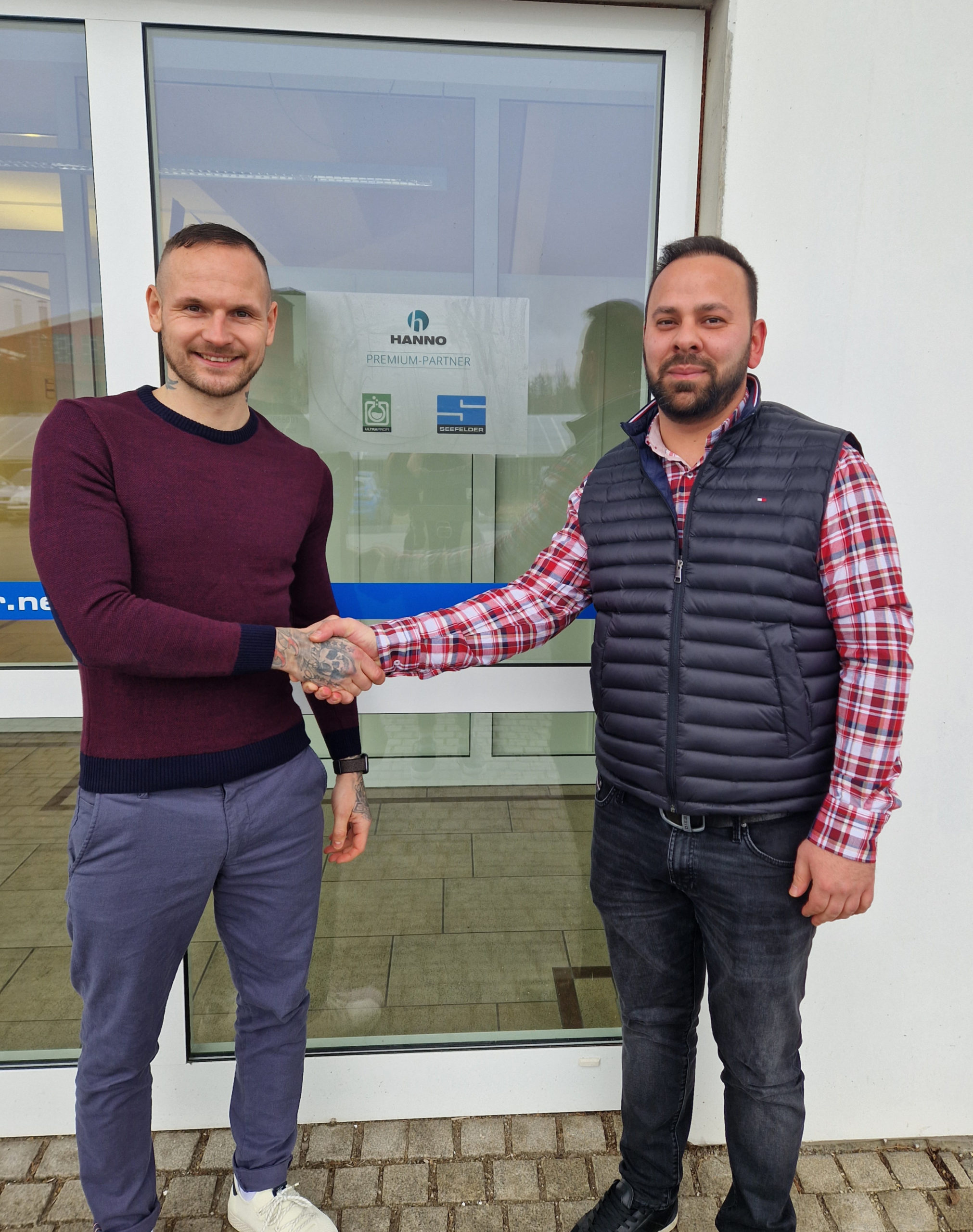 (V.r.n.l.): Mehmet Coban, Gebietsleiter Südost bei Hanno, gratuliert Thomas Rußwurm, Senior Category Manager/Sortimentsverantwortung bei Seefelder GmbH, zur Hanno-Partnerschaft. Ein neues Programm unterstützt Marken-Händler im Marketing, bietet Schulungen und persönlichen Beratungsservice.
