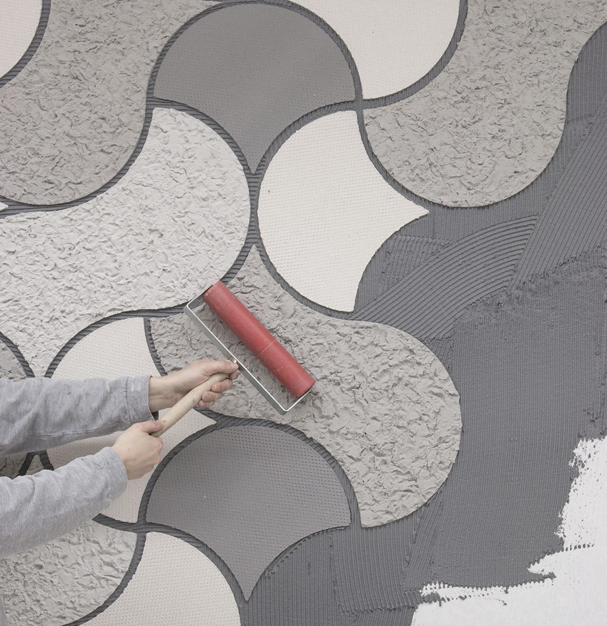 Mörtel werden die Sto-Ecoshapes mit einer Tapezierrolle angedrückt.