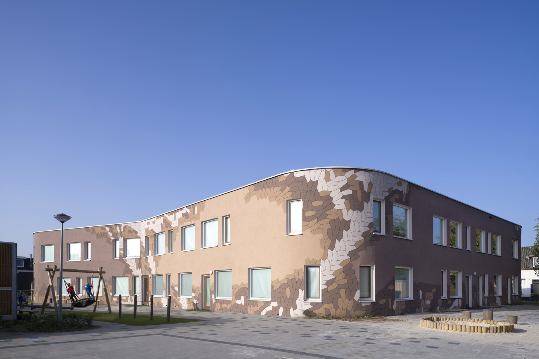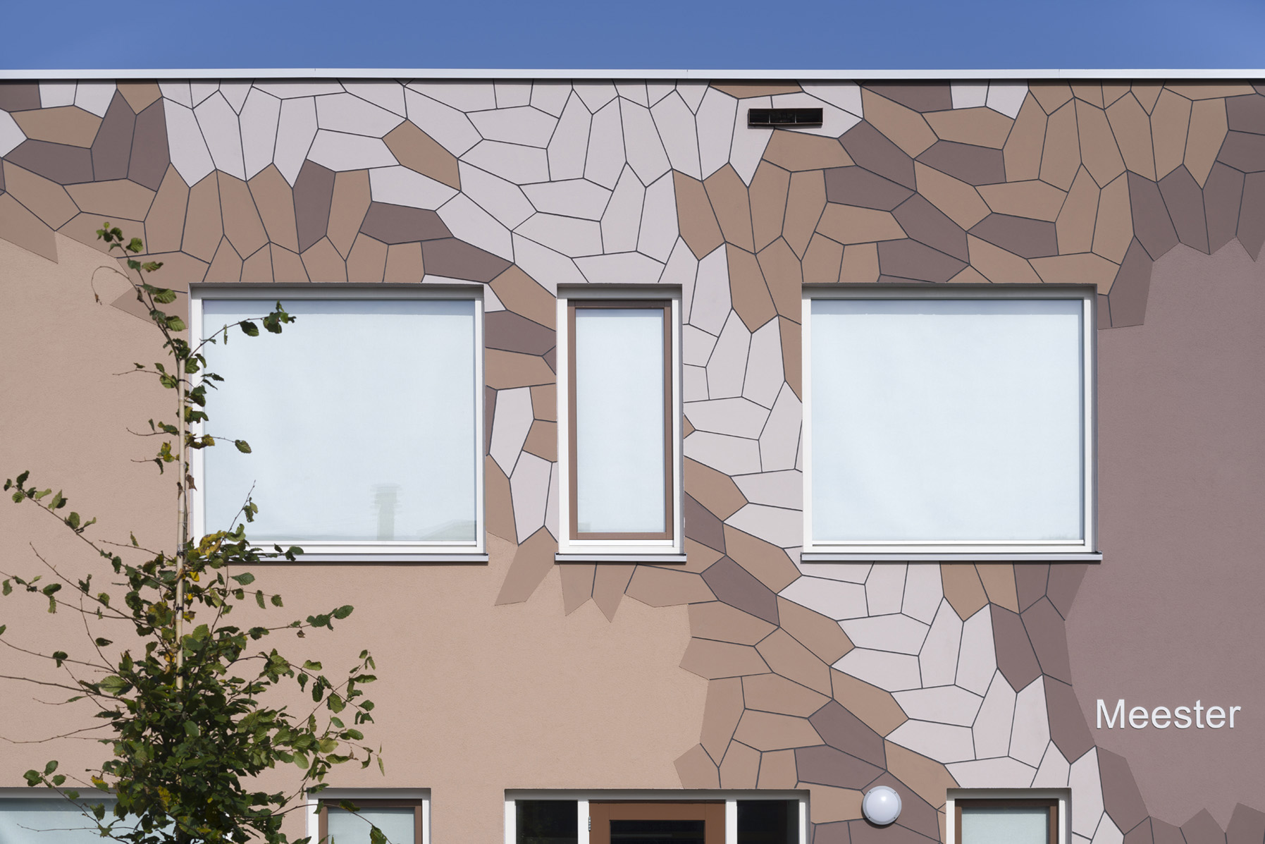 Welch außergewöhnliche Fassaden mit Ecoshapes möglich sind, zeigt eine Schule in den Niederlanden: Zwei ineinander geschobene Volumina formen den zweigeschossigen Neubau der Brede School de Garve in der 33.000-Einwohner-Gemeinde Lochem. Sanft gerundete Ecken und eine außergewöhnliche Fassadengestaltung verleihen dem Schulbau inmitten vieler Klinkerbauten ein modernes, aber unaufdringliches Äußeres. Die hochgedämmte Fassade wurde in einem hellen Vollmilch-Schokolade-Ton verputzt und partiell mit vieleckigen Sto-Eco-shapes in unterschiedlichen Braun- und Beige-Tönen belegt. Die so strukturierten Fassadenteile erinnern gleichermaßen an den Schuppenpanzer einer Echse wie an florale Muster oder begrünte Fassaden. Das Zusammenspiel der ruhigen flächig verputzten Fassadenabschnitte und der mit Sto-Ecoshapes belebten Flächen erzeugt gemeinsam mit den variierenden Fensterformaten eine gestalterische Spannung, die das Gebäude perfekt in die überwiegend kleinteilige Umgebungsbebauung einbindet.