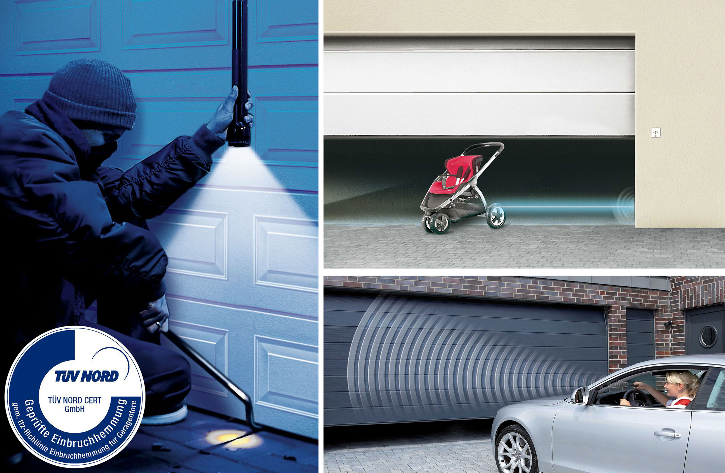 Sicherheit geht vor: Moderne Garagentore bieten hohen Schutz gegen Einbruchversuche – manche Tore belegen das mit dem Zertifikat des TÜV. Damit keine Schäden durch Unachtsamkeit entstehen können, stoppen Lichtschranken das Tor, bevor es gegen ein Hindernis läuft. Moderne Verschlüsselungsverfahren verhindern zudem, dass der Funkcode für den Antrieb gekapert werden kann.