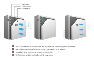 Das Funktionsprinzip StoTherm In SiMo und StoTherm In Aevero: Durch hygrothermische Prozesse kann Feuchtigkeit in das Innendämmsystem eindringen (links). Durch Taupunktereignisse kann Feuchtigkeit in der Kleberschicht ausfallen. Die Kleberschicht speichert die anfallende Feuchtigkeit (Mitte). Bei Entlastung wird die Feuchtigkeit wieder abgegeben (rechts).