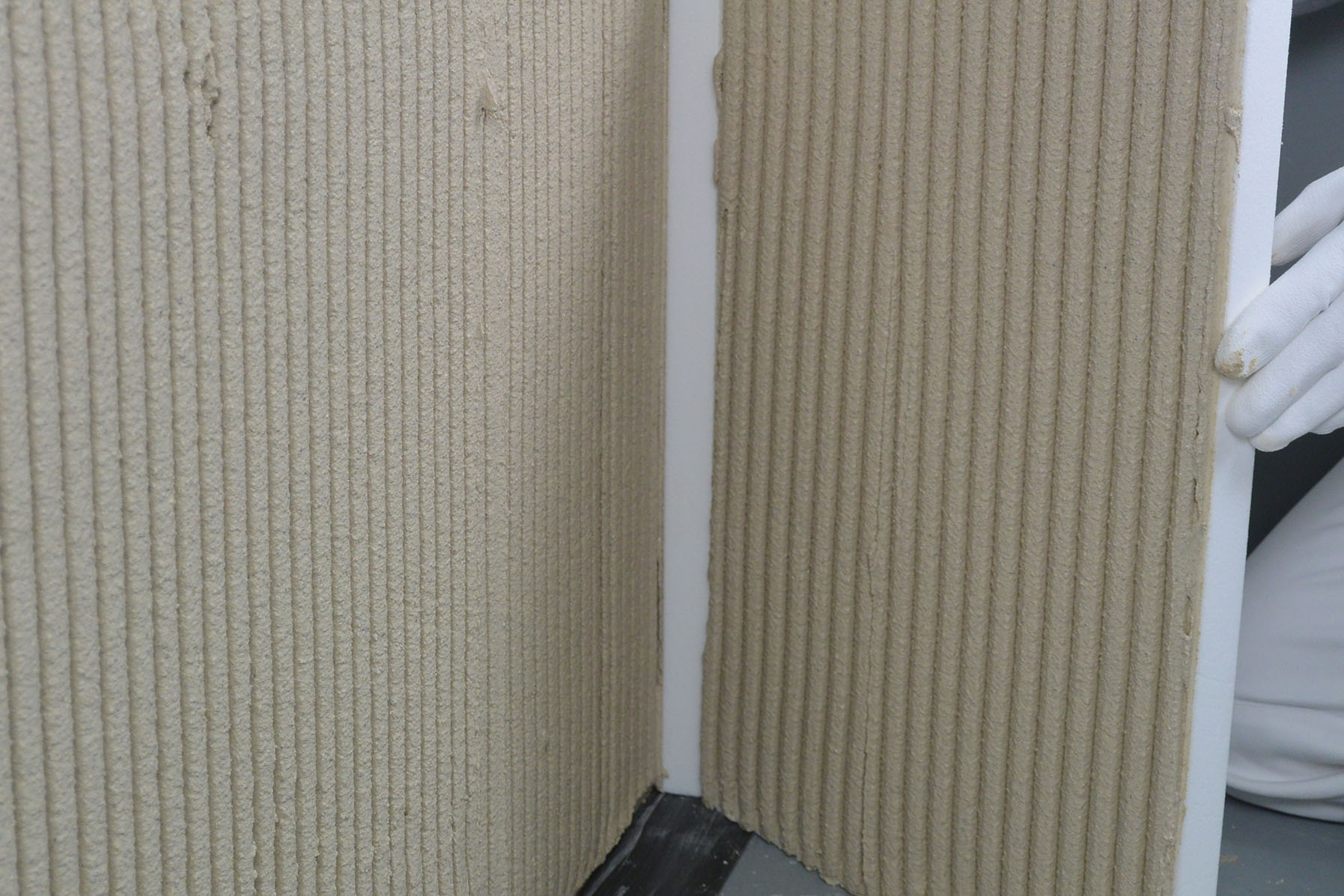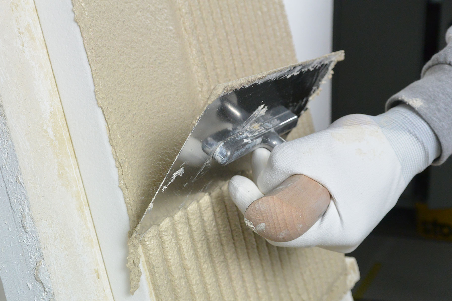 Das neue anwendungsfreundliche Sto-PFB-Klebeverfahren für Innendämmsysteme stellt die Vollflächigkeit des Kleberauftrags bei definierter Schichtdicke in nur einem Arbeitsgang sicher. Möglich wird das durch eine neue, zum Patent angemeldete Zahntraufel und eine neue Verlegetechnik.
