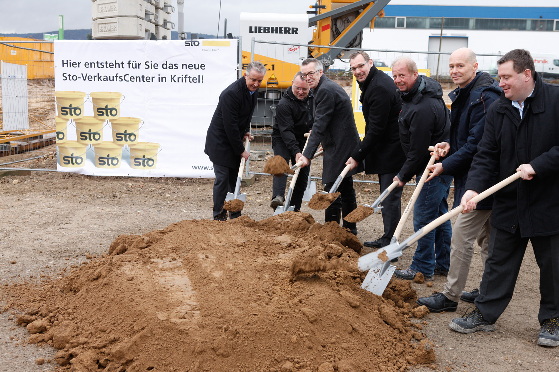 Der Spatenstich zum Bau des neuen Sto-VerkaufsCenters in Kriftel erfolgte durch (von links) Axel Wulf, Leiter Vertriebsregion Rhein-Main Sto; Roland Thiemt, Regionalleiter Logistik Sto; Franz Jirasek, Erster Beigeordneter der Gemeinde Kriftel; Christian Seitz, Bürgermeister der Gemeinde Kriftel; Jürgen Burkhardt, Generalplanung und Bauleitung; Ulrich Gisy, Leiter Standortplanung Sto; Jörg Brömer, Generalunternehmer.