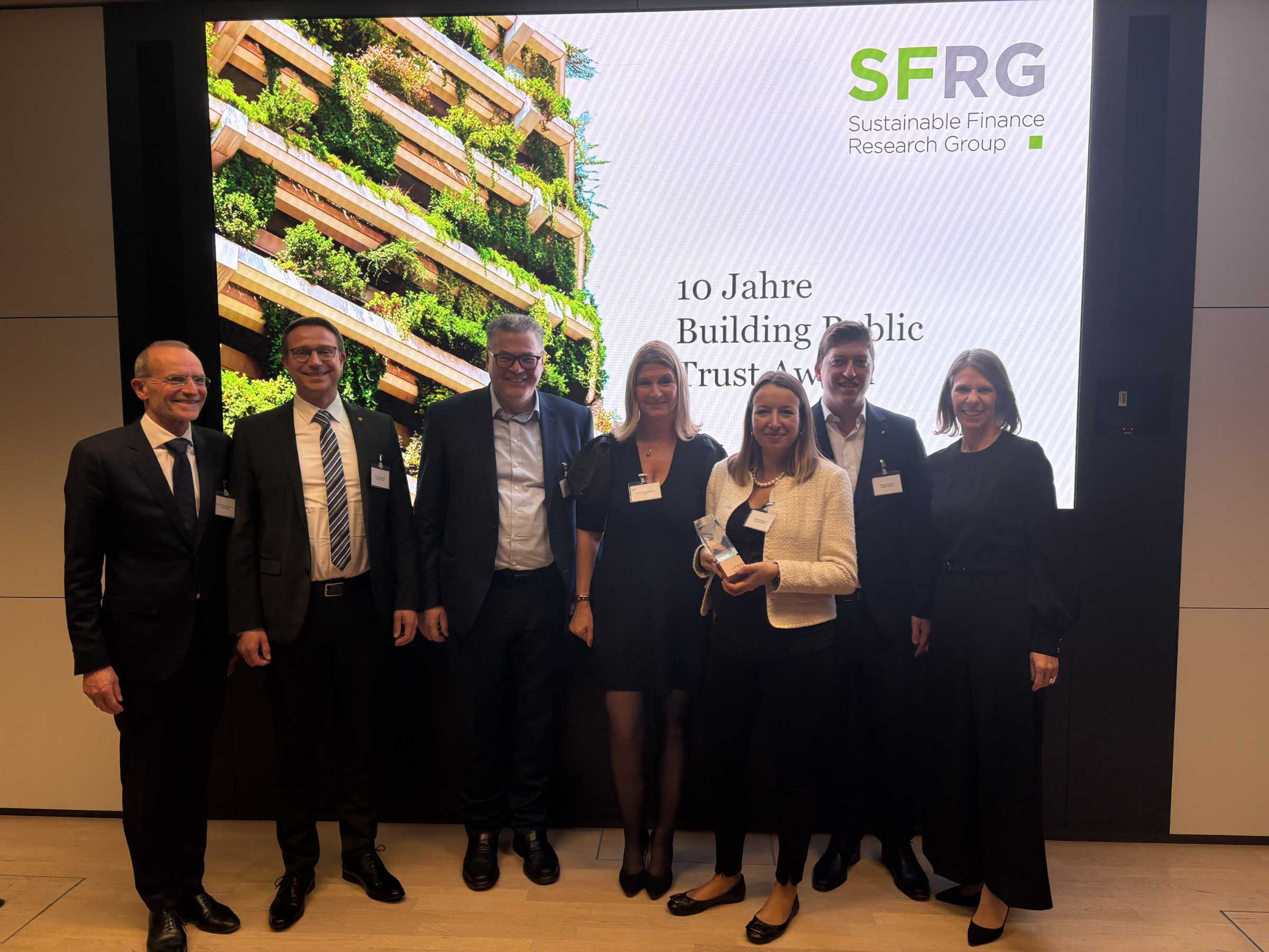Sto-Finanzvorständin Désirée Konrad (3. v.r.) nimmt gemeinsam mit Sto-Kollegen und PwC-Mitarbeitenden die Auszeichnung entgegen.