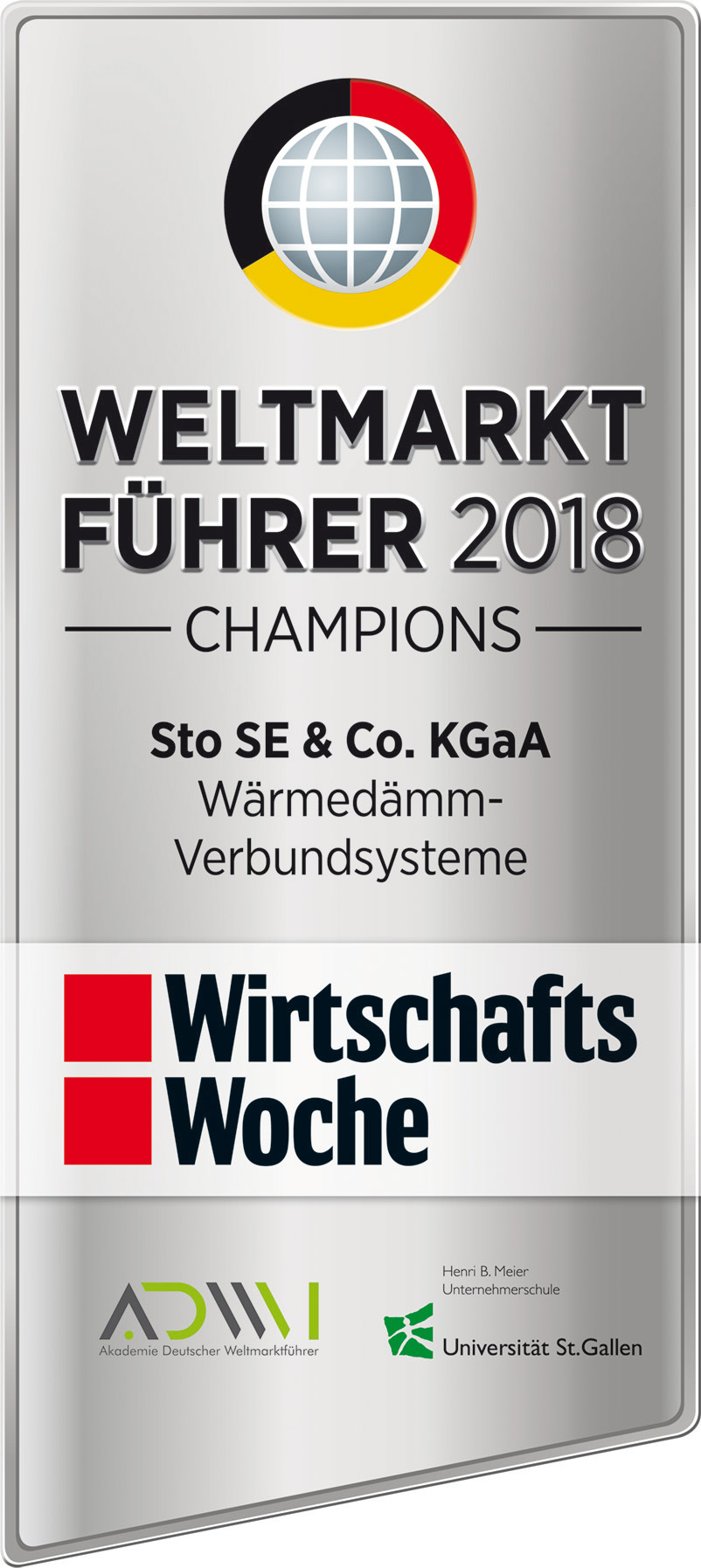 Die HBM Unternehmerschule der Uni St. Gallen und die „Wirtschaftswoche“ haben im Rahmen eines Forschungsprojektes Weltmarktführer aus Deutschland, Österreich und der Schweiz definiert – im Marktfeld Wärmedämm-Verbundsysteme ist dies das Stühlinger Unternehmen Sto SE & Co. KGaA.