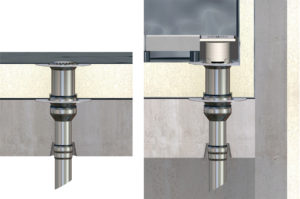 Balkonentwässerung mit der Serie V bietet mehrere Lösungen, u.a. für Balkonabdichtung mit Flüssigkunststoffen oder Abdichtungsbahnen. Beispiele sind Führungen mit Klebeflansch (Serie V-FL – links) oder mit aufgekantetem Klebeflansch (Serie V-AK).