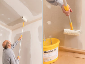 Grundierungen binden Staub auf der Oberfläche, sorgen für gleichmäßiges Saugverhalten und dafür, dass der Folgeanstrich haftet. Speziell für silikatische Produkte hat Sto jetzt eine neue Grundierung entwickelt: StoPrim GT, die mit ihrer speziellen Gelstruktur tropffreies Arbeiten ermöglicht und für ein streifenfreies Streich-Ergebnis sorgt. Sie eignet sich für nahezu alle Untergründe, von Gipskarton über Beton bis zu Kalkoberflächen. Besonders bei sandenden oder saugenden Untergründen, die sehr hohe Anforderungen an die Grundierung stellen, zahlt sich der Einsatz der Dispersions-Silikatgrundierung aus, denn das neue, verarbeitungsfertige Material aus dem Eimer bindet den Untergrund bis zu dreimal besser als Standardgrundierungen. Dadurch verhindert StoPrim GT zuverlässig, dass die folgende Innenfarbe nicht vom Untergrund aufgesaugt wird. Zudem verlängert sie die Offenzeit der Folgebeschichtung. StoPrim GT ist transparent und tropfgehemmt. Durch die gelartige Konsistenz kann die Grundierung gespritzt und aufgerollt werden – auch über Kopf. Außerdem ist StoPrim GT lösemittel- und weichmacherfrei sowie emissions- und konservierungsmittelarm und erfüllt so die Ansprüche an ökologisches, gesundes Bauen im Innenraum.