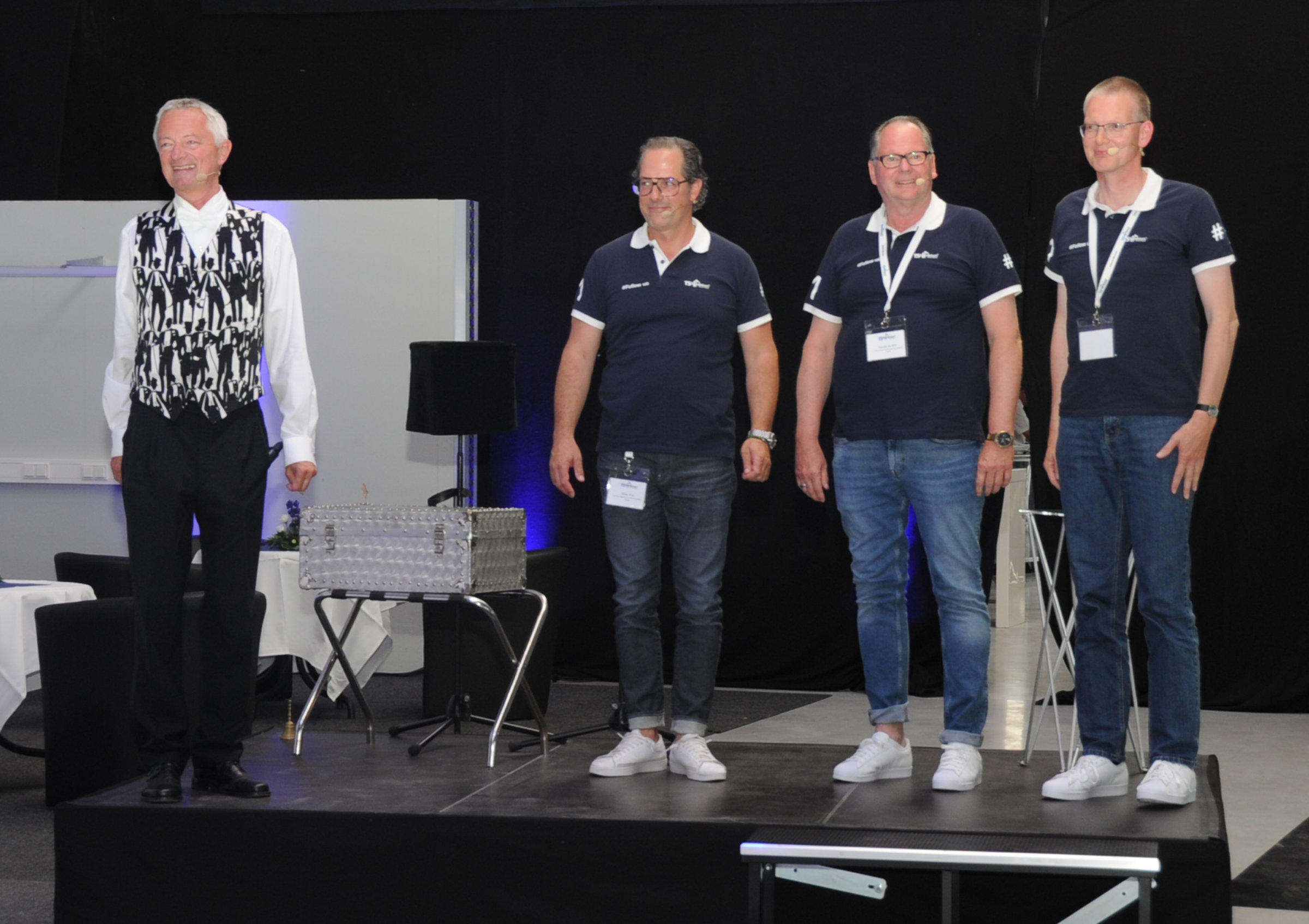 V. r. n. l.: Geschäftsführer Rainer Trauernicht führte gemeinsam mit Vertriebsleiter Harald de Witt und Marketing-Spezialist Oliver Prim durch den Abend. Unterhaltungskünstler Master Me“ Michael Schürkamp sorgte währenddessen für amüsante Show-Einlagen.