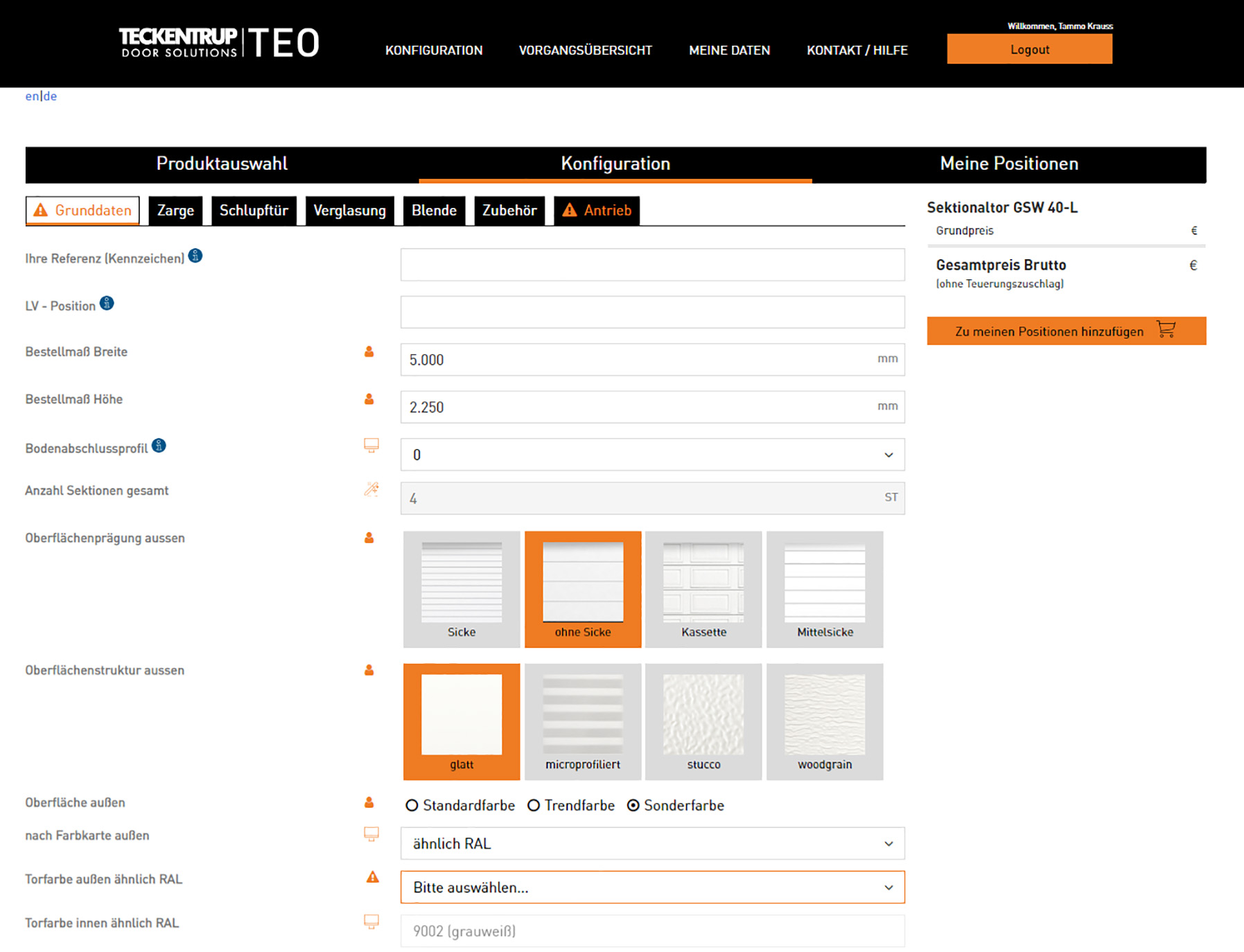 „TEO – Teckentrup einfach online“ heißt das Kalkulations-Modul, mit dem sich schnell und widerspruchsfrei Türen und Garagentore konfigurieren lassen. Das gemeinsam mit Verarbeitern und Händlern entwickelte Tool hat mittlerweile seine Beta-Phase erfolgreich überstanden und ist durch das intensive Feedback der Nutzer optimal auf die Anforderungen der Anwender abgestimmt. „Da wir von Anfang an auf Co-Creation gesetzt haben, konnten wir das Programm an die User anpassen – und fordern nicht von Ihnen, sich an das System anzupassen“, sagt Firmenchef Kai Teckentrup.
