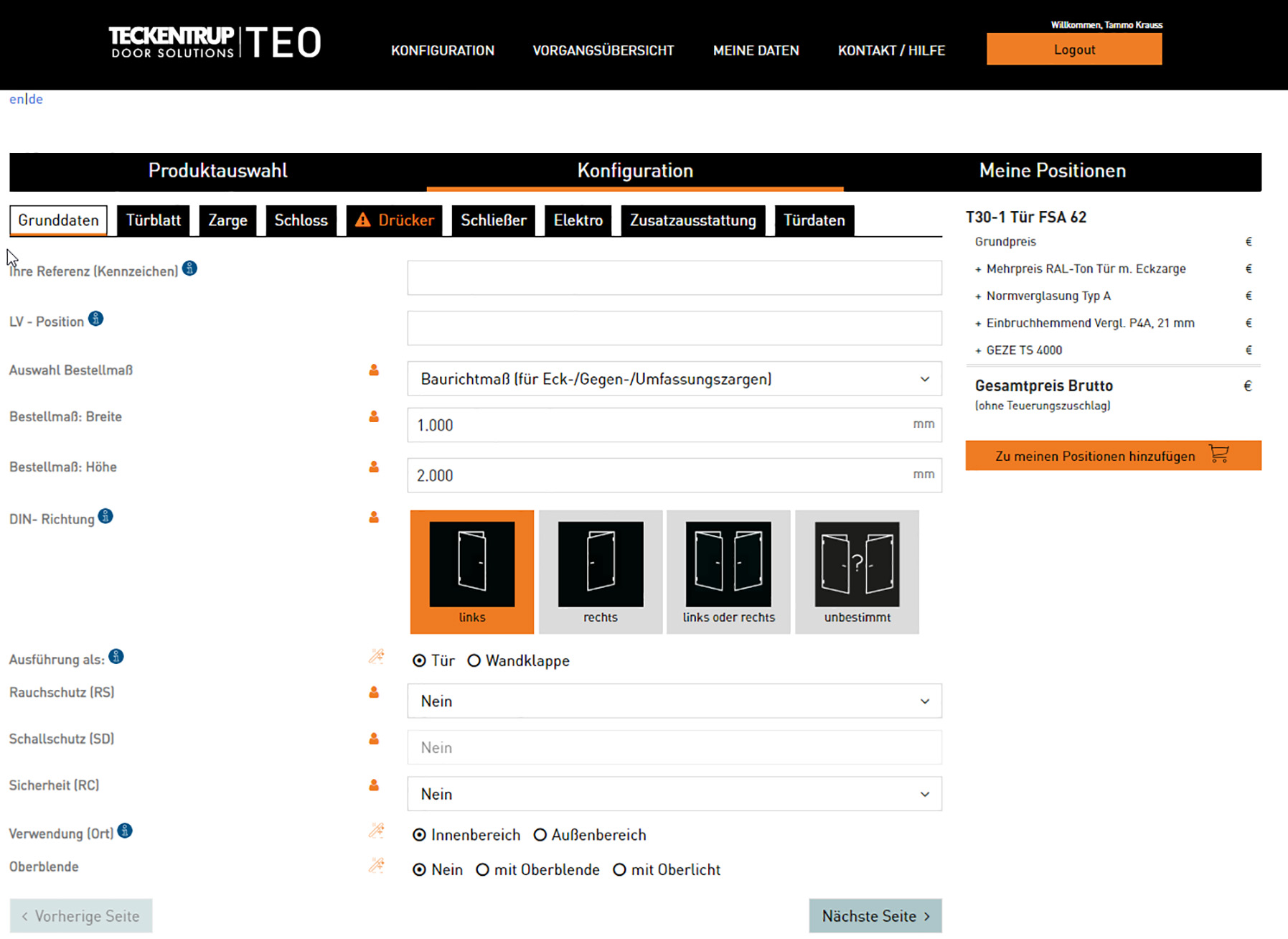 Der intuitiv bedienbare Konfigurator sorgt dafür, dass eine Tür widerspruchsfrei geplant und kein relevantes Detail vergessen wird. Fehler – beispielsweise eine nicht zugelassene Drückergarnitur bei einer Feuerschutztür – sind so ausgeschlossen. „Wir haben uns mit der Entwicklung Zeit gelassen und immer wieder Anwender mit dem System arbeiten lassen. Dadurch ist der Konfigurator genau auf die Bedürfnisse der Profis zugeschnitten“, erklärt Kai Teckentrup. Das umfasst den Aufbau im Ganzen und reicht bis zu den Details – zum Beispiel die Option, die Auswahl „Rechts- / Links-Tür“ erst später zu treffen, die weiteren Daten aber schon komplett zu hinterlegen, um so früh einen Angebotspreis ermitteln zu können.