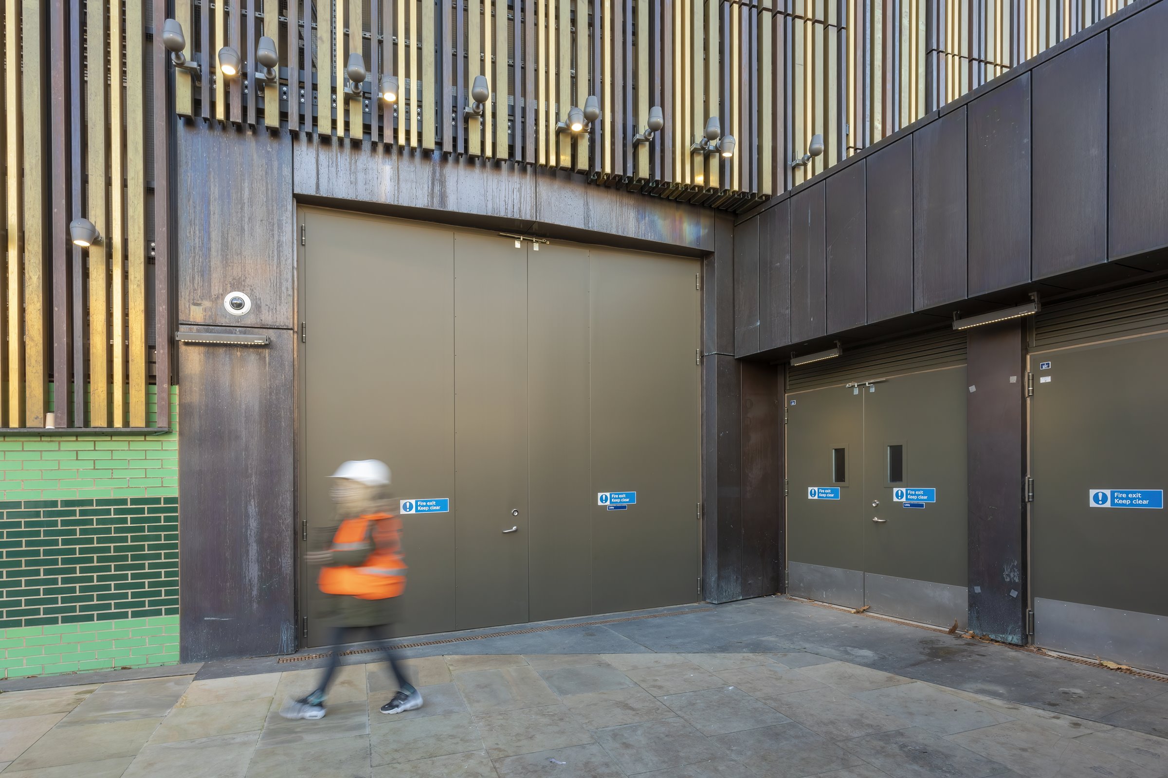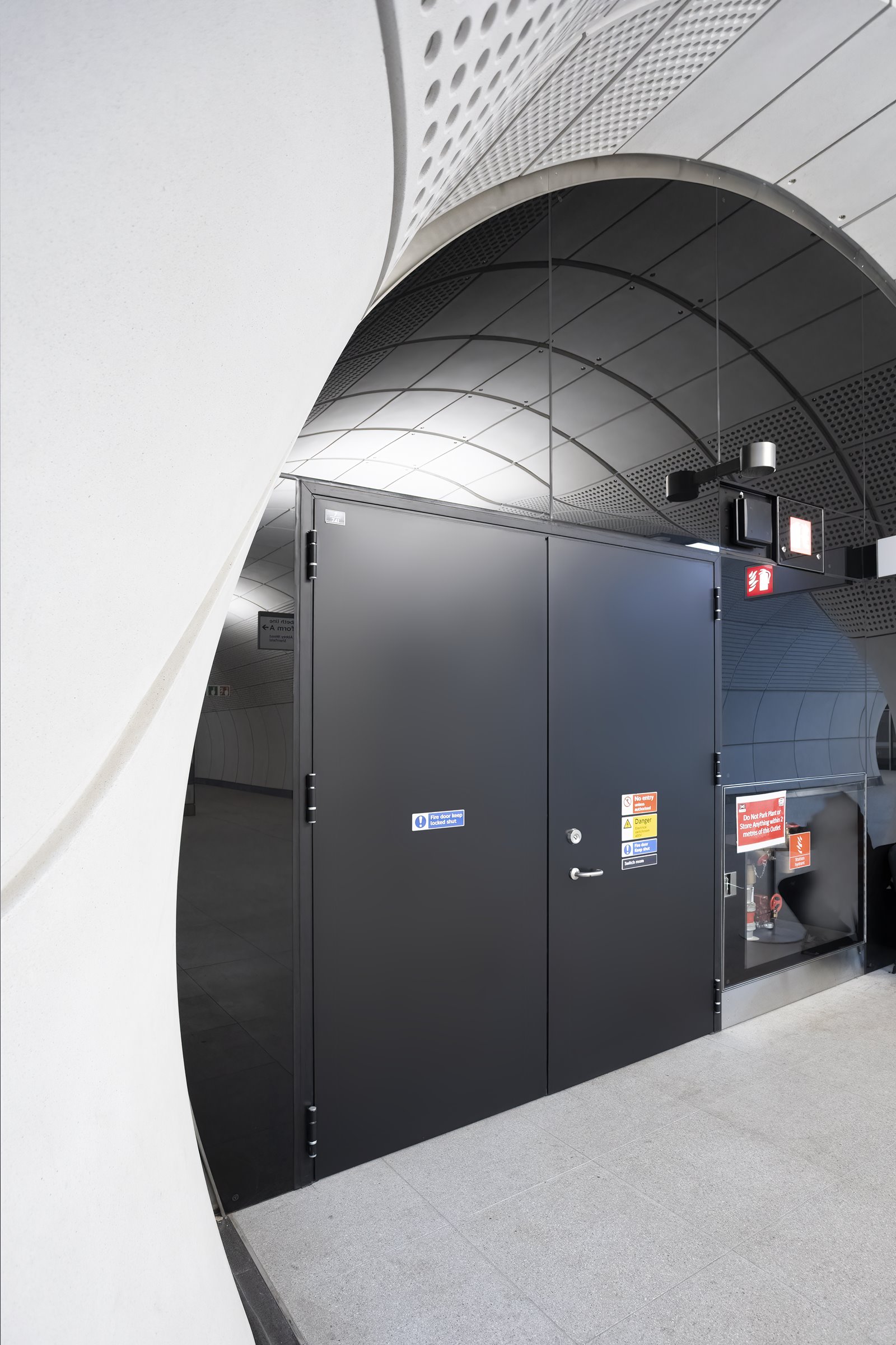 Um den Lärm zu mindern, entwickelte Teckentrup speziell für das Crossrail-Projekt eine Doppeltürlösung. Zur DW67-Tür mit einem Schallschutz von 57 dB (Rw) kam als zweites Element eine T60-Tür mit 42 dB Schallschutz, Druckwiderstand von 5 kPa in beiden Richtungen und SR3-Sicherheit.
