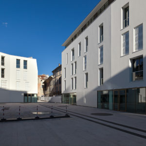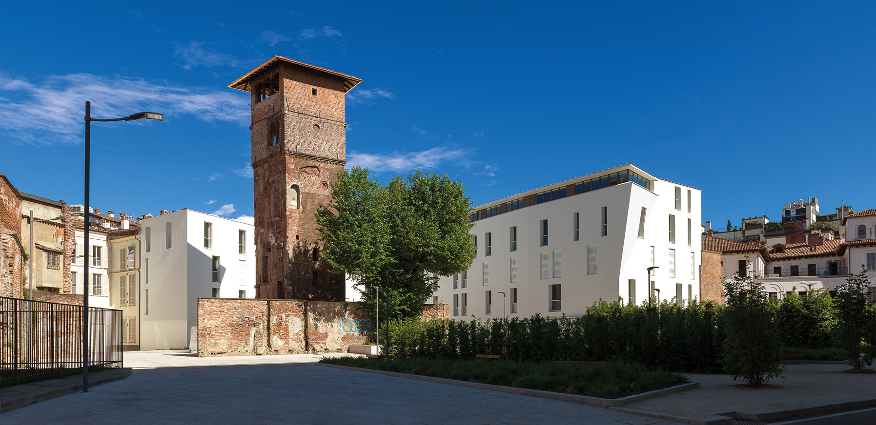 Neu und alt, Ruhe und Metropole: Gleichzeitig mit den Wohnhäusern „Residenze Gorani“ planten Cecchi & Lima Architetti Associati einen öffentlichen Platz, der einen Ort der Ruhe im Herzen von Mailand bietet. Wie Kulissen rahmen die blütenweißen Fassaden der beiden keilförmig zueinander platzierten Wohnbauten den Platz ein. Sie lenken den Blick auf den zentralen Turm, der als Relikt an den im 11. Jahrhundert erbauten Palazzo Gorani erinnert, der den Bomben des Zweiten Weltkriegs zum Opfer fiel. Unweit verweisen Mauerreste und weitere Ruinen auf die römische Vergangenheit der Stadt. In ihrer einheitlichen monolithischen Erscheinung treten die Neubauten in Dialog mit den Relikten. Großzügige Fensterfronten auf Straßenebene bieten direkte Aussichten auf die historische Stätte. Runde, in den Gehweg geschnittene Glasöffnungen geben den Blick auf Fragmente von Mosaiken frei, die hier zwischen 2009 und 2011 archäologische Ausgrabungen zutage förderten. In den Eingangsbereichen der Neubauten erinnern ornamental verzierte Kupferpaneele an die Funde. Die neu angelegten Grünflächen komplettieren den neuen Platz und wirken als verbindendes Element an einem sensiblen Ort, der Urbanität und Stadtgeschichte miteinander in Einklang bringt.