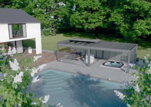 Modern und geradlinig: Das Lamellendach von TS-Aluminium überzeugt in kubischer Architektur und ist mit einem Glasdach kombinierbar.