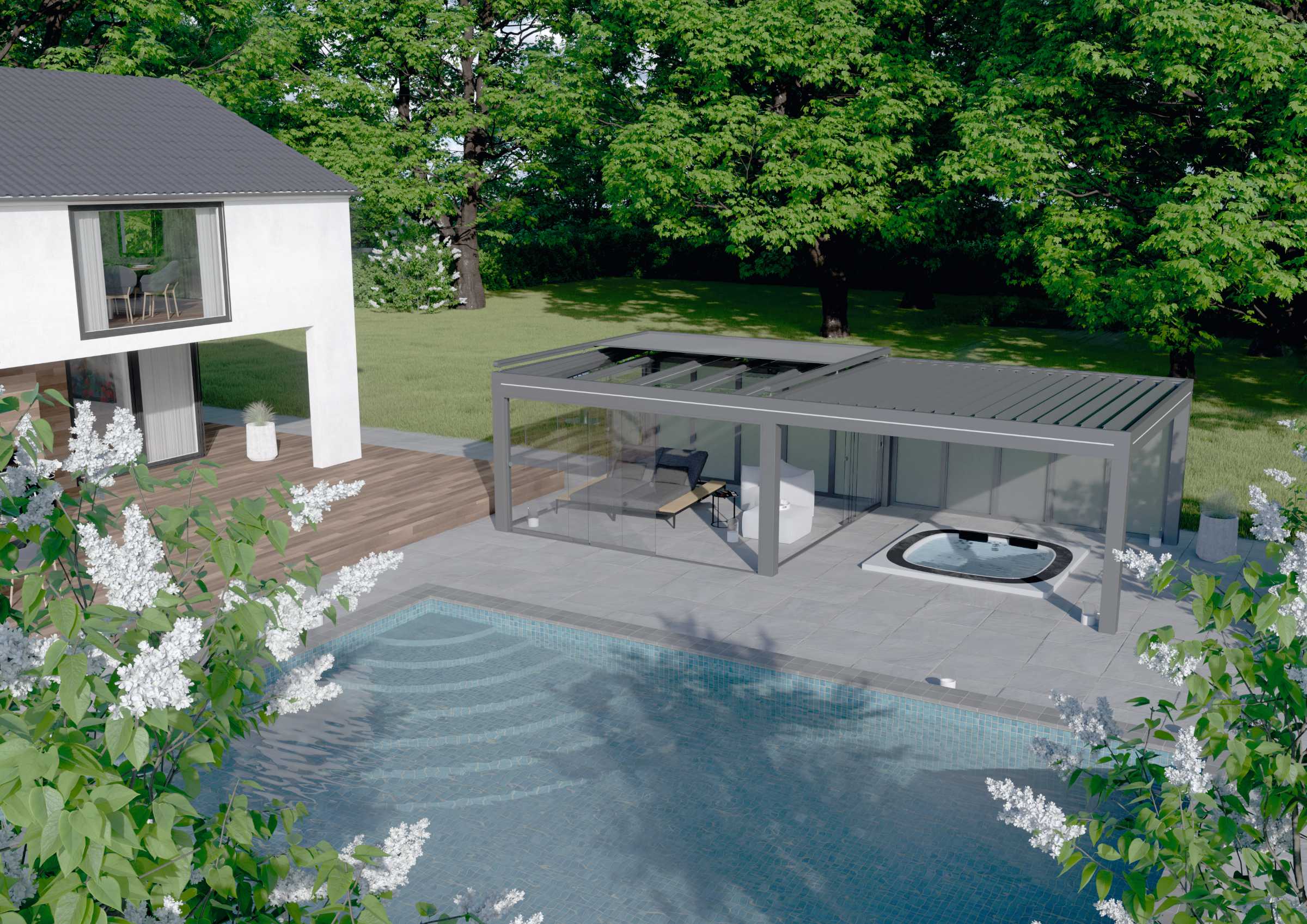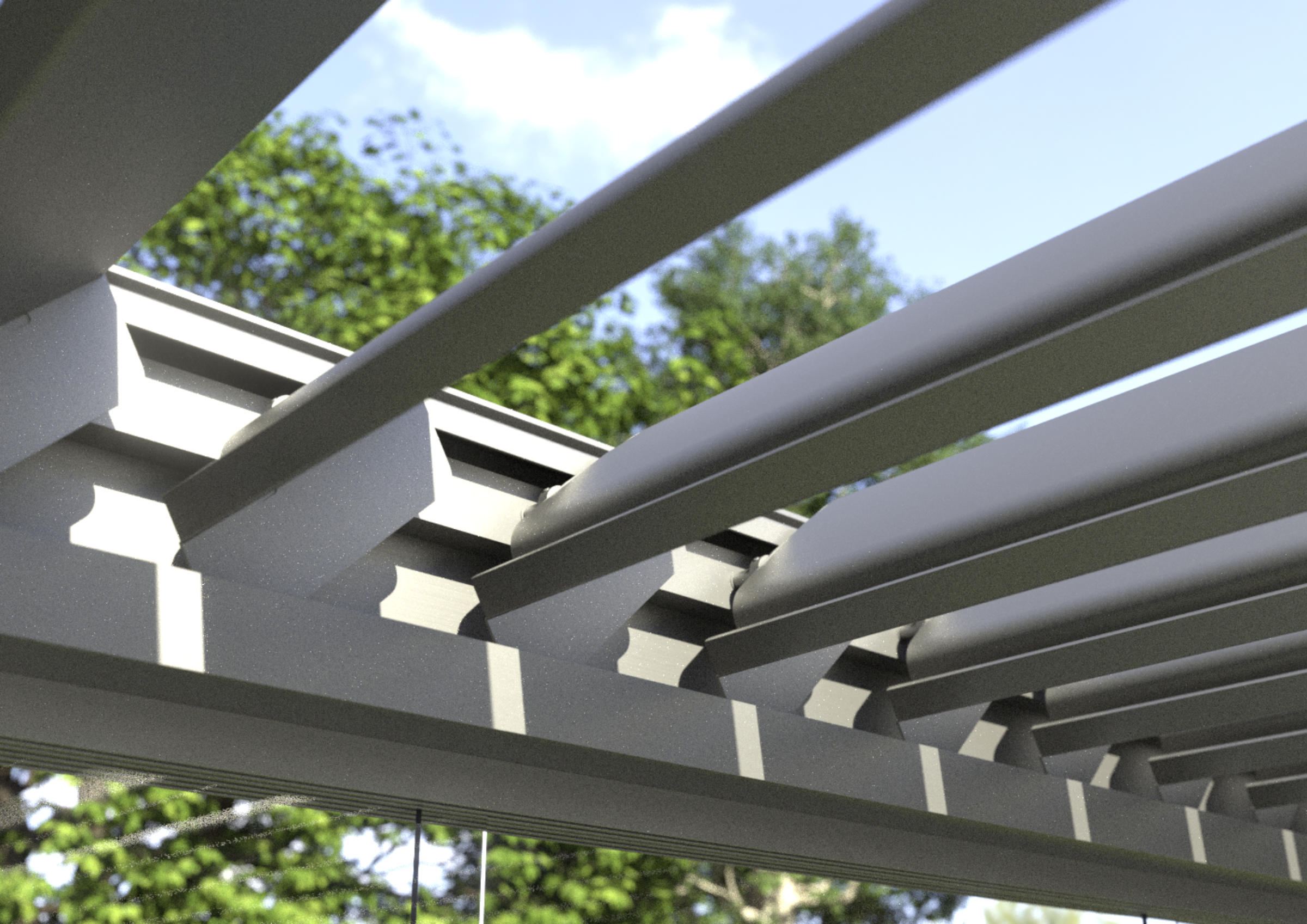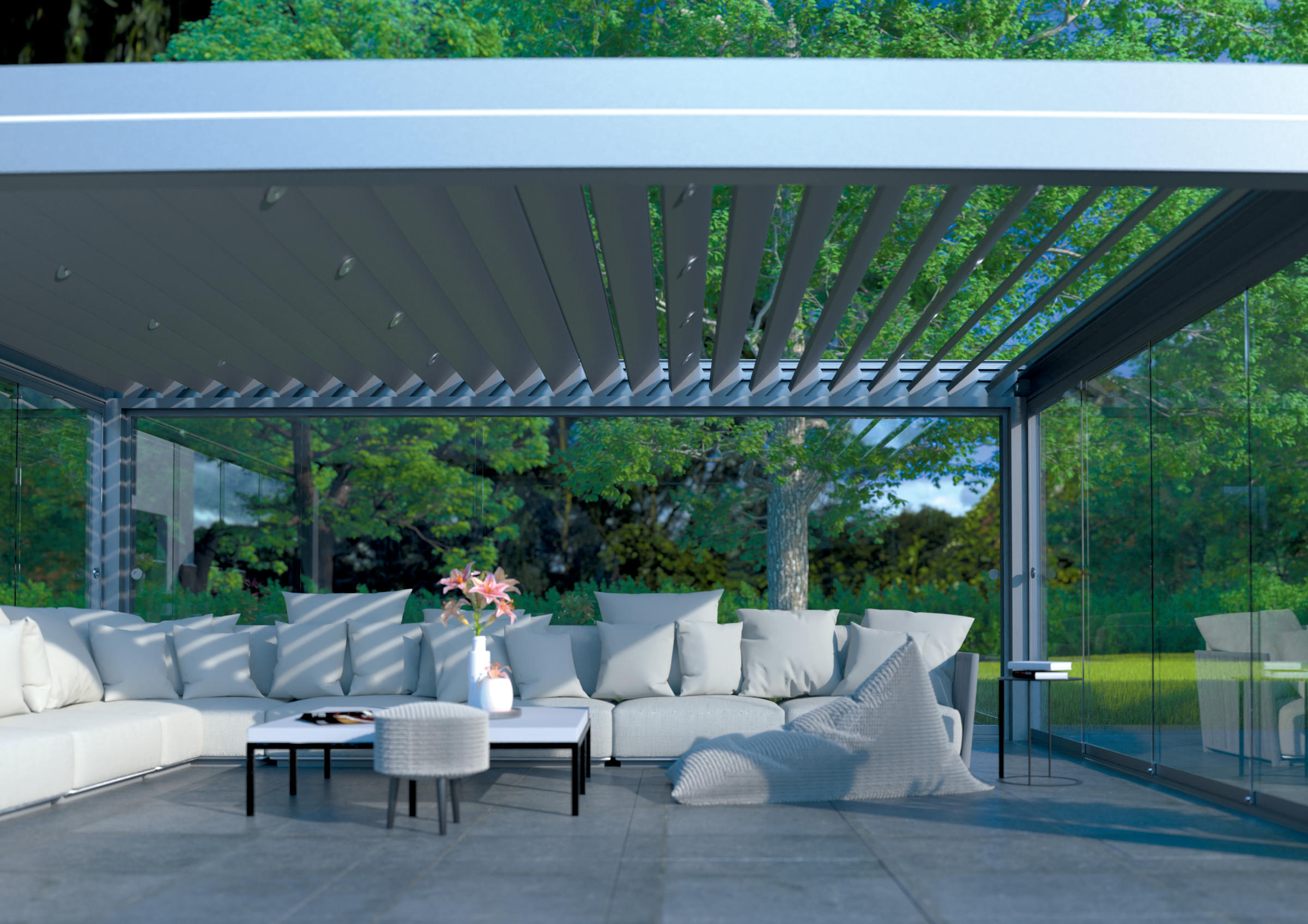 Bis 135 Grad drehbare Lamellen regulieren Licht, Schatten und natürliche Belüftung unter dem Dach ganz nach Wunsch. Dafür sind smarte Sensoren nicht sichtbar integriert, die sich bequem per App oder Fernbedienung steuern lassen. Hochwertige Wetterautomatik (Regenwächter) sorgt bei Niederschlag dafür, dass sich das Dach von alleine schließt. Geschlossen trägt das Lamellendach bis 350 Kilogramm Schneelast pro Quadratmeter. Für die individuelle Gestaltung stehen vielfältige Ausstattungsoptionen zur Wahl, von LED-Beleuchtung über ZIP-Markisen bis hin zu Heizsystemen.