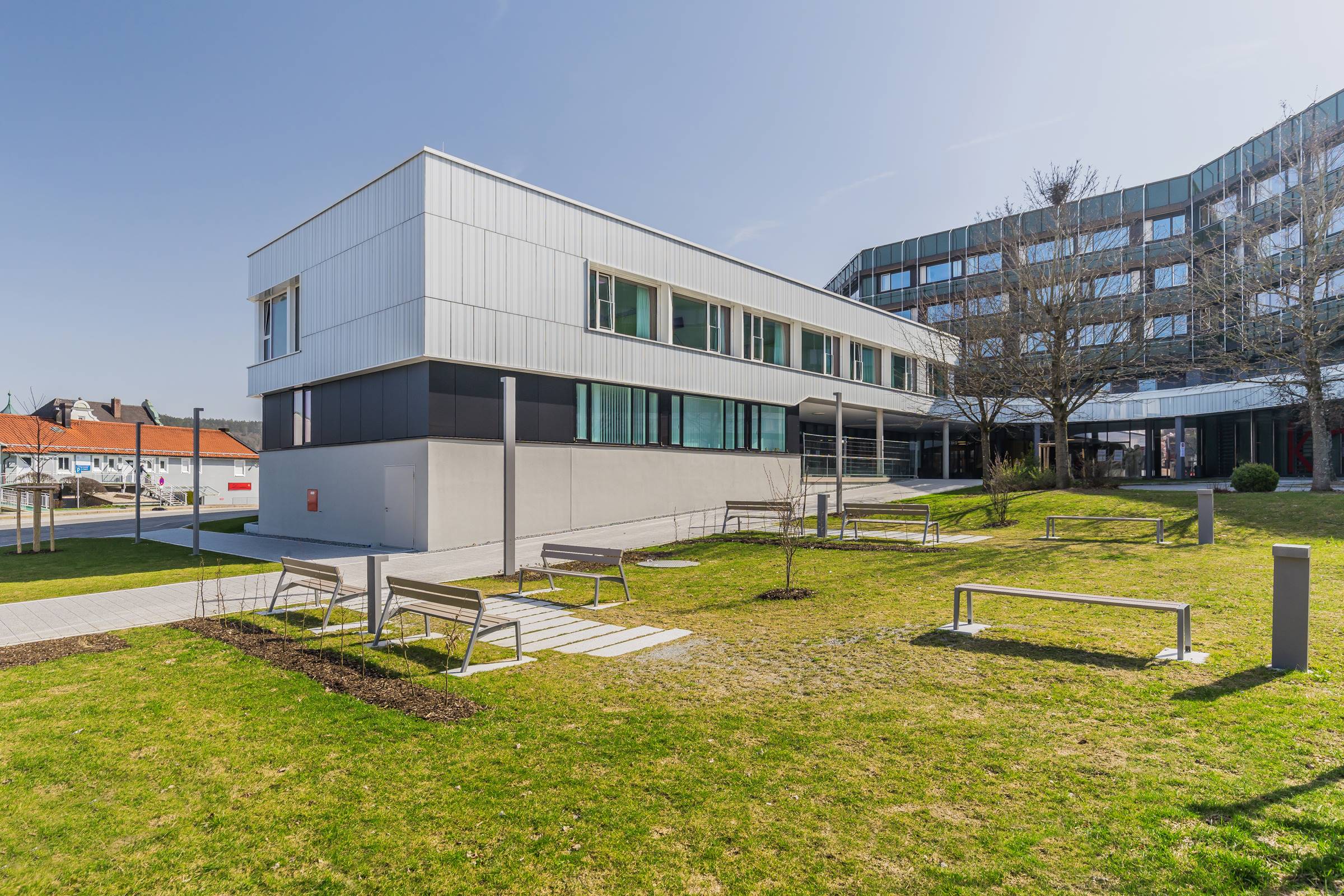 Werden die Glaselemente vor dem Verkleben mit der Trägerplatte rückseitig digital bedruckt, entstehen neue Gestaltungsmöglichkeiten, wie bei diesen unregelmäßig großen Paneelen an einem Krankenhaus in Freyung (plan/4 architekten, München).
