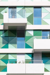 Die maximal sechs Quadratmeter großen Paneele des StoVentec Glass-Systems müssen nicht rechteckig sein, wie das Beispiel einer Pariser Wohnanlagenfassade (Beckmann N’Thépé, Paris) zeigt.