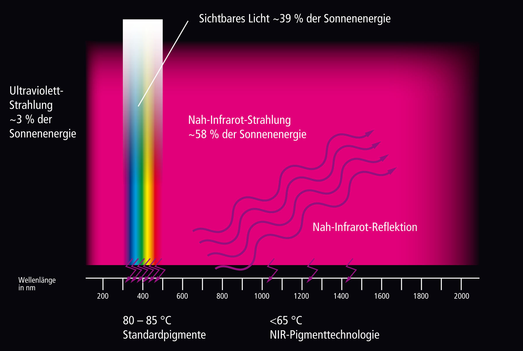 StoColor X-black reflektiert Nah-Infrarotstrahlung und hält darum auch dunkle Oberflächen deutlich kühler als herkömmliche Fassadenfarben. Auch die sogenannte NIR-Pigmenttechnologie basiert auf einem ausgewogenen Funktionsstoff-Mix.