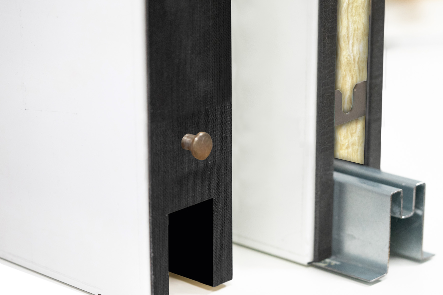- Bei den Torelementen in der Version EI230 mit der Montage über das Stecksystem werden die Elemente über ein Pilzkopfsystem einfach und schnell miteinander verbunden. Neben dem Montagevorteil bietet dies den optischen Effekt: Keine sichtbaren Verschraubungen.