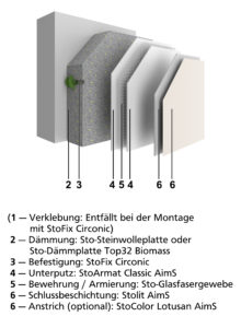 Zur besonders nachhaltigen Lösung wird StoFix Circonic im System StoTherm AimS. Es ist derzeit das einzige Fassadendämmsystem, dessen Beschichtungen (ein Unterputz, ein Oberputz, eine bionische Fassadenfarbe) teilweise auf nachwachsenden Rohstoffen (NawaRos) beruhen. Die Bindemittel dieser zementfreien Beschichtungen werden zu 30 Prozent aus Kiefernöl (aus Holzverarbeitungsresten) hergestellt. Das spart fossile Rohstoffe und verringert CO2-Emissionen. Zusammen mit der ökozertifizierten (redCERT), biomassebilanzierten Sto-Dämmplatte Top32 Biomass spart das System rund 80 Prozent erdölbasierte Grundstoffe bei der Herstellung, der CO2-Ausstoß liegt 30 Prozent unter dem von vergleichbaren Standardsystemen mit EPS-Dämmung.