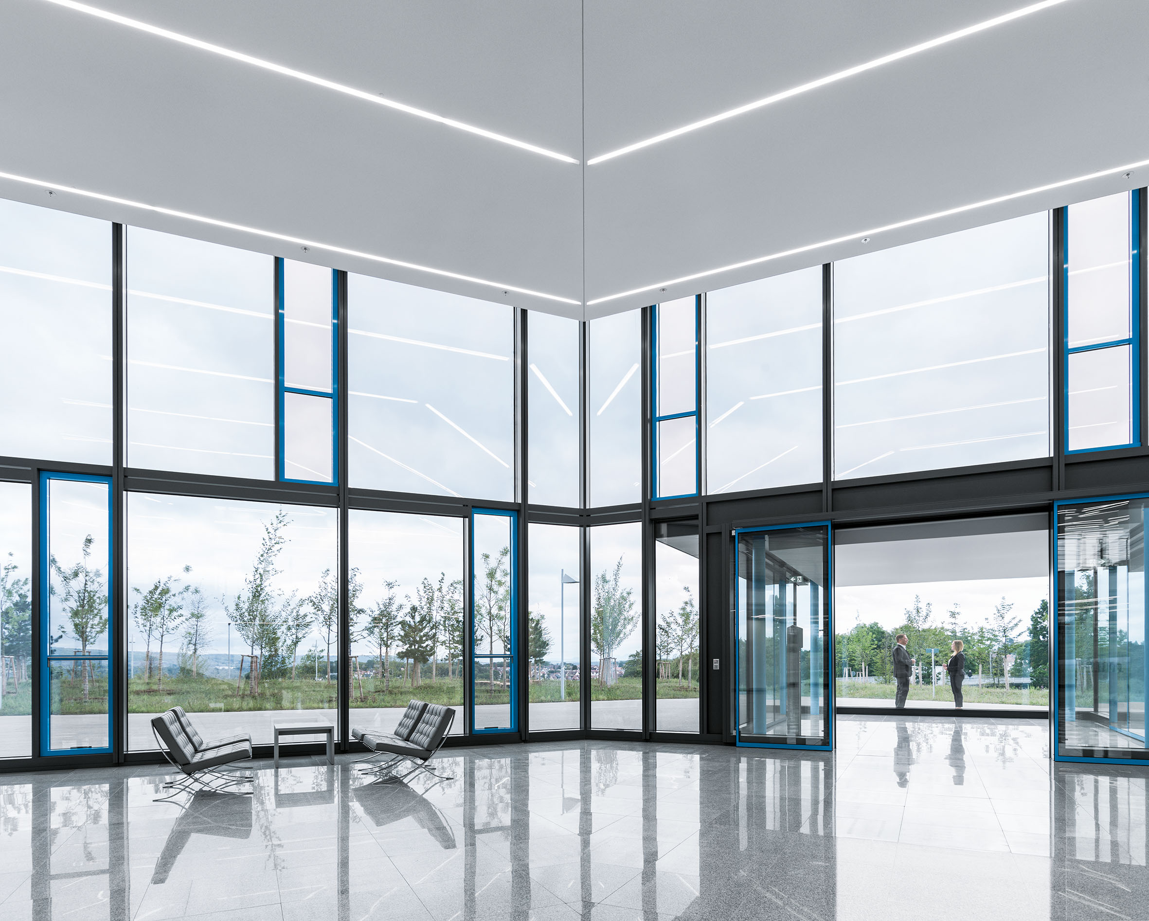 Das dimmbare elektrochrome Glas ist in den 441 Parallelausstellfenstern des Gebäudes verbaut. Es lässt sich über die Gebäudeleittechnik stufenlos und automatisiert von hell bis blau einfärben. Je Stockwerk und Fassade sorgen sieben raumhohe Fensterelemente gerade auch in eingedunkeltem Zustand für eine offene Kommunikation mit der Außenwelt.