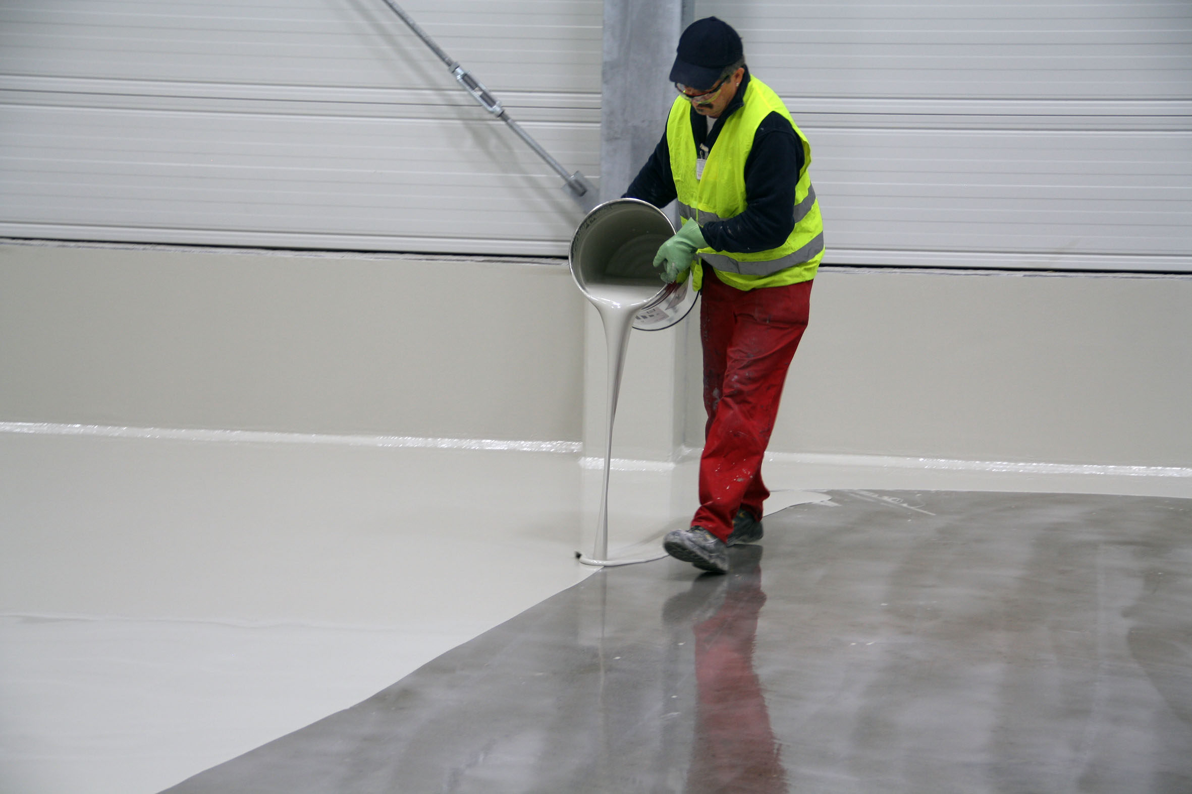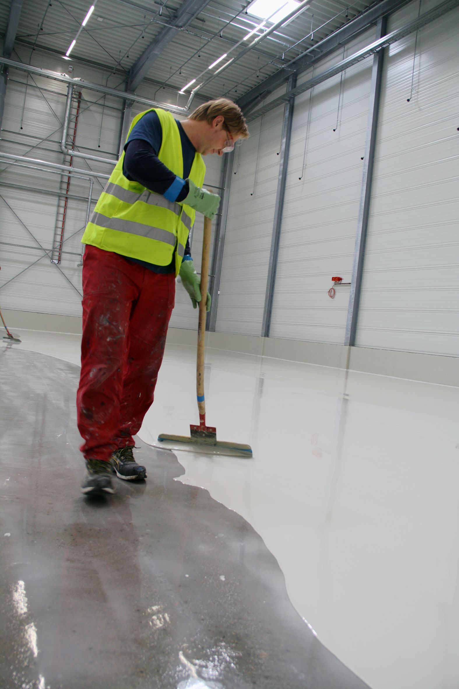 Das Epoxidharz StoPox WHG Deck 100 wird auf der Bodenfläche verteilt …