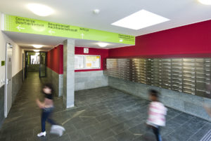 Damit die Bewohner in Zukunft tatsächlich wie geplant weniger Energie verbrauchen, mussten die Planer von Adrian und Partner, Freiburg, sowie Roland Rombach, Kirchzarten, das Hochhaus mit neuer Technik ausstatten. Auf dem Dach gibt es eine Solarstromanlage mit 25 Kilowatt Spitzenleistung, im Dachgeschoss drehen sich große Industrieventilatoren. Sie saugen Frischluft an, die im Wärmetauscher durch Abluft erwärmt wird. Außerdem musste die Gebäudehülle energieeffizient werden. Dach, Fassade und Kellerdecke wurden deshalb mit einer 20 Zentimeter dicken Dämmung (teilweise mit Natursteinoberfläche) versehen und die neuen Fenster dreifach verglast.