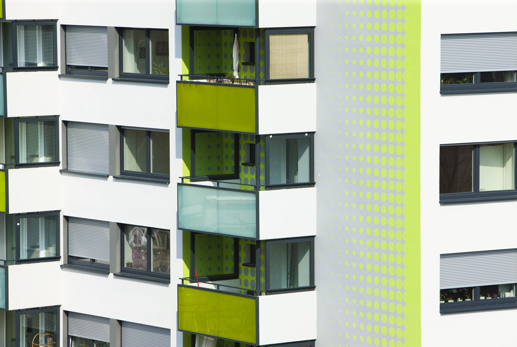 Der Aufwand scheint sich gelohnt zu haben: Heute ist der Heizwärmebedarf von jährlich 68 auf 15 Kilowattstunden pro Quadratmeter gesunken. Die Bewohner benötigen 80 Prozent weniger Heizenergie. Durch neue Grundrisse ist die Wohnfläche zudem insgesamt um fast 1.000 Quadratmeter gestiegen. 49 zusätzliche Wohneinheiten entstanden so für den überhitzten Freiburger Mietmarkt – ohne zusätzliche Baugrundstücke zu benötigen. Der Trick dabei: Die bestehenden Loggien integrierten die Planer in die Wohnungen und setzten stattdessen neue Balkone vor die von vom Freiburger Malerbetrieb Hermann Emter in Zusammenarbeit mit StoDesign gestaltete Fassade, auf der eine Oberfläche mit Lotus-Effekt-Technologie für lange Renovierungsintervalle sorgt.