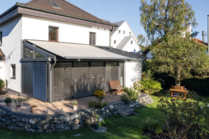 Ein flexibler Sonnenschutz, der sich optimal an die Bebauung anpasst, sind filigrane Alu-Raffstores. Sie prägen mit ihrer Ästhetik den Stil des Anbaus. Bei vertikalen Stores sind die Lamellen leicht verstellbar und bieten bei jedem Wetter und zu jeder Tageszeit den passenden Schutz. Für hohe Stabilität sind sie zusätzlich gebördelt.