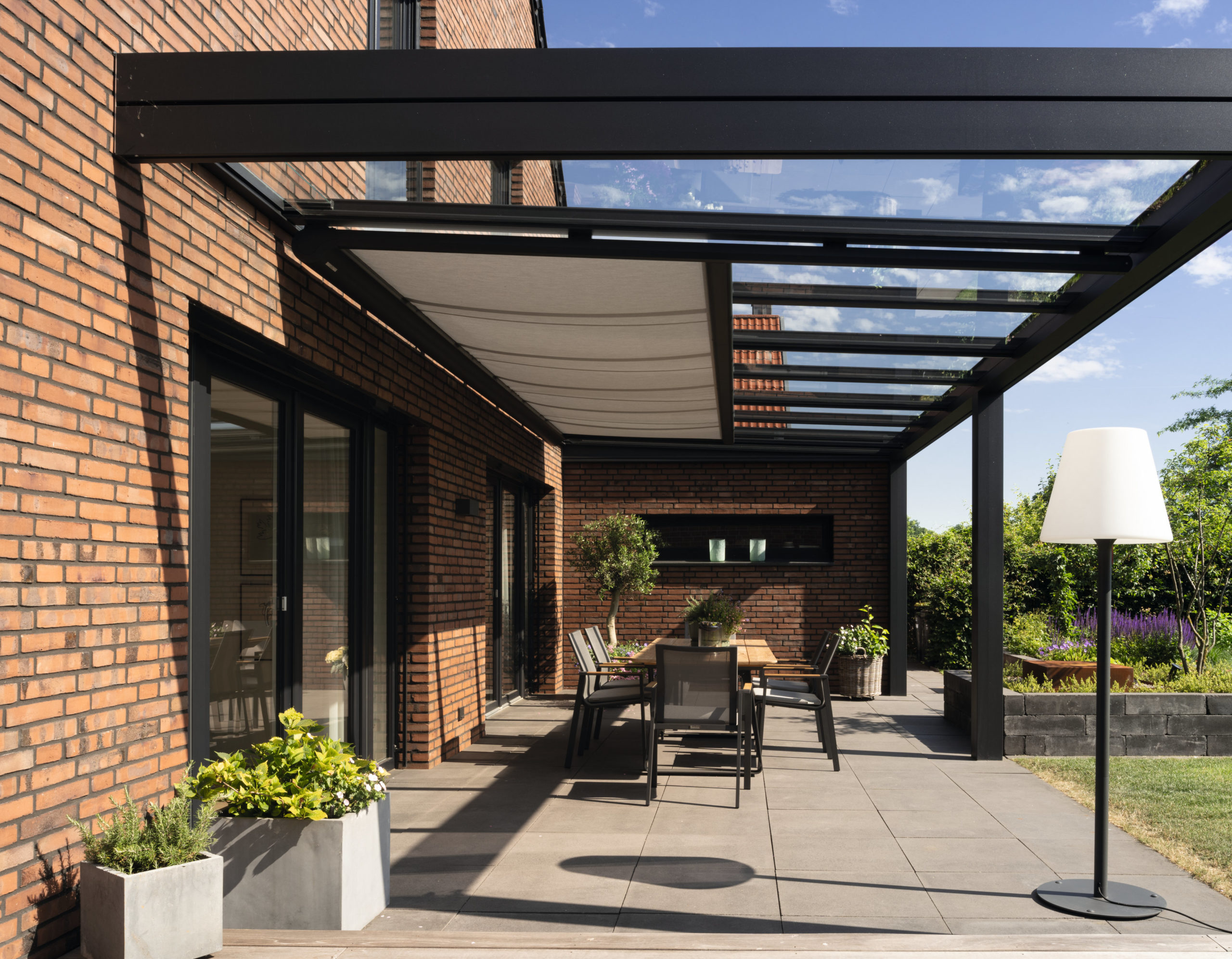 Unterglasmarkisen eignen sich optimal für Terrassendächer: Das Glasdach schützt sie vor Witterung.